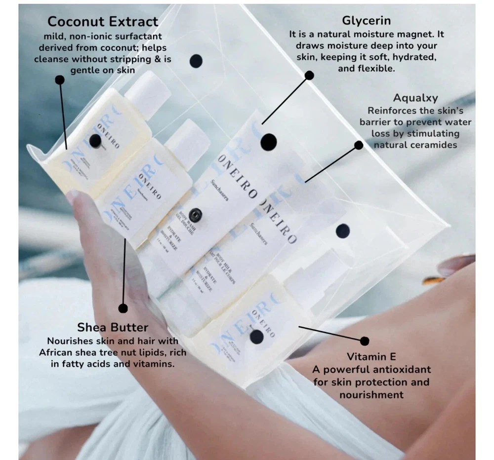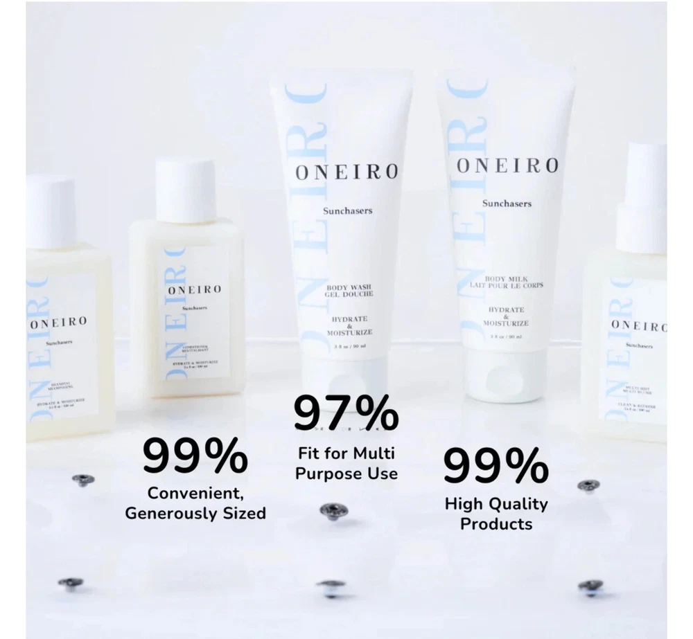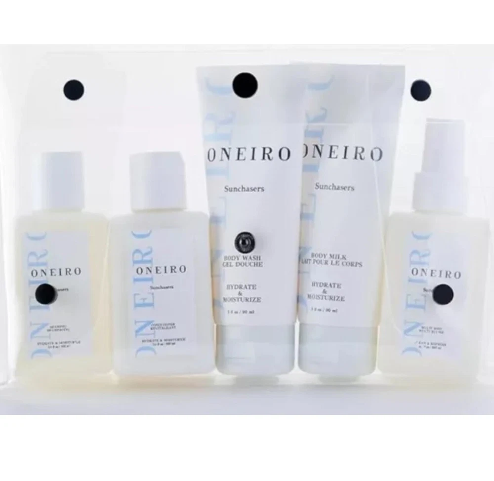 ONEIRO Sunchasers Travel Kit Ready Clean & Vegan Personal Care New/Sealed All bottles are new and sealed Comes with a clear travel bag Fresh scent that smells amazing! Perfect for travel with generous sized bottles!
