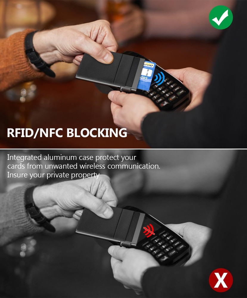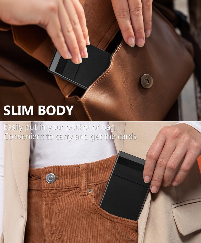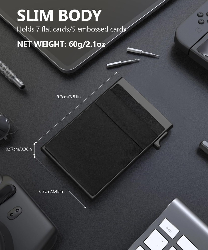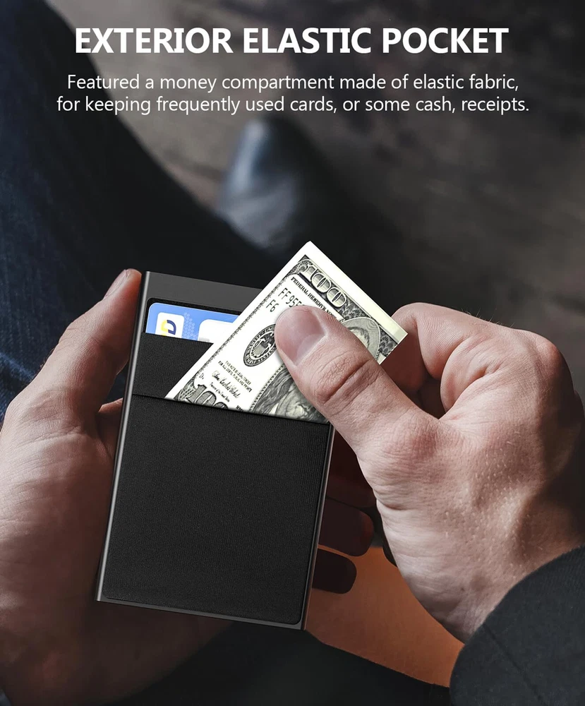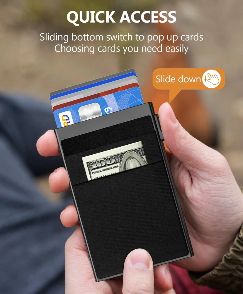 ONLOOKER Credit Card Holder - Slim Wallet for Men with Money Pocket, Pop Up Wall Features: QUICK ACCESS & LARGE CAPACITY - Fumbling through your pop up wallet should be a thing of the past. Our signature automatic mechanism ejects your cards at the flick of a switch. Hold 5 cards in pop up card case. 2-3 cards & bills available for 2 extra slots, the actual capacity depends on the card thickness. BUILT TO LAST - Designed for portable daily use. The forged 6061-T6 aerospace-grade aluminum construction provides added durability & weight savings over a traditional wallet. Slimline pocket-sized small wallet(3.81*2.55*0.43 Inches), convenient and safe to put in any pocket and carry around. RFID/NFC PROTECTION - Advanced aluminium builder offers the best solution for unpredictable risks from RFID/NFC scanning. and ensures thieves can’t hi-jack your credit card information. Inside strip holds cards tightly, so that your cards won't drop out even your turn the hard case upside down. ADDITIONAL POCKET - Not just only a phone card holder, attach it to your phone, car, desk, fridge or any other place you want and get extra storage space. Our card holder easily hold your debit cards, ID card, cash, earphone, key, notes, coins even gum. QUALITY SERVICE - Need a replacement? No problem. The sturdy inner mechanism and premium materials make your wallet last for a long time. If you have any queries or need any assistance please get in touch with us. Features: QUICK ACCESS & LARGE CAPACITY - Fumbling through your pop up wallet should be a thing of the past. Our signature automatic mechanism ejects your cards at the flick of a switch. Hold 5 cards in pop up card case. 2-3 cards & bills available for 2 extra slots, the actual capacity depends on the card thickness. BUILT TO LAST - Designed for portable daily use. The forged 6061-T6 aerospace-grade aluminum construction provides added durability & weight savings over a traditional wallet. Slimline pocket-sized small wallet(3.81*2.55*0.43 Inches), convenient and safe to put in any pocket and carry around. RFID/NFC PROTECTION - Advanced aluminium builder offers the best solution for unpredictable risks from RFID/NFC scanning. and ensures thieves can’t hi-jack your credit card information. Inside strip holds cards tightly, so that your cards won't drop out even your turn the hard case upside down. ADDITIONAL POCKET - Not just only a phone card holder, attach it to your phone, car, desk, fridge or any other place you want and get extra storage space. Our card holder easily hold your debit cards, ID card, cash, earphone, key, notes, coins even gum. QUALITY SERVICE - Need a replacement? No problem. The sturdy inner mechanism and premium materials make your wallet last for a long time. If you have any queries or need any assistance please get in touch with us. eBay integration by
