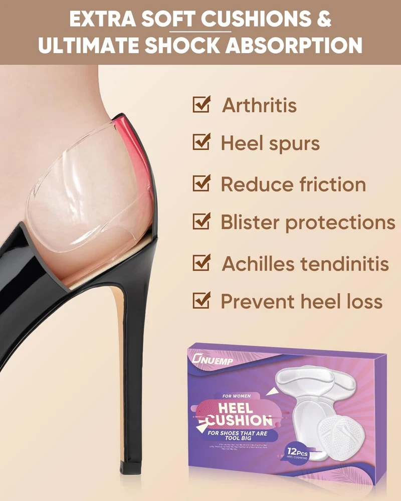 ONUEMP Heel Cushion Inserts and Metatarsal Pads for Women, 3 Pairs Heel Grips and 3 Pairs Ball of Foot Cushions, Silicone Shoe Pads Insoles for High Heels, Blister Prevention for Too Big Shoes Heel Cushion Inserts and Metatarsal Pads for Women, 3 Pairs Heel Grips and 3 Pairs Ball of Foot Cushions, Silicone Shoe Pads Insoles for High Heels, Blister Prevention and Foot Care Protectors for Too Big Shoes - Fits all High Heels - Easily sticks (Non-slip) - Provides IMMEDIATE pain relief π 3 Pairs * Heel Pads & 3 Pairs * Ball of Foot Cushions for heels π : 12 pieces heel inserts for women in a nice package. π HIGH QUALITY MATERIAL π : Contouring to the heel for greater support and comfort, each silicone heel protector and metatarsal pad is constructed with a premium, latex-free medical grade silica gel. High elasticity and flexibility. π SAY GOODBYE TO HEEL & FOOT PAINS π : ONUEMP heel cushions and ball of foot cushions for women absorb impact and shock, preventing you from foot pain, blister, plantar fasciitis, metatarsal foot pain, rubbing and slide. π ONE SIZE FITS MOST π : Moderate thickness, so it leaves room for your feet. But we still suggest you to use the high heel comfort pads inside the looser fitting shoes to avoid causing your feet discomfort due to squeezing. Perfect for high heels, flats, pumps and boots. π SELF-ADHESIVE & REUSABLE π : Adopt powerful sticky backing. These shoe inserts for women can be removed and sticked to other pair of shoes again. If the adhesive loses its tackiness, just wash the heel grips with warm and soapy water, let it dry and you can stick it again. Do not dry on the sun. π LIFETIME SATISFACTION GUARANTEE π : If this set of heel pads for shoes does not relieve your forefoot pain or heel pains, simply let us know! We stand behind our product and we know that it will help you. Shipping from the USA All of our products are shipped from the USA, ensuring quick delivery to your destination. Payment We offer the following payment methods: PayPal, credit card, bank transfer, and eBay's secure payment system. Free Shipping & Free Returns Shipping within the USA is FREE. Additionally, any return is absolutely free for you. Risk-Free Purchase You have the option to return an item within 30 days without any justification. We cover the return shipping costs! Fast Shipping We ship immediately upon receipt of payment. Generally, the package is delivered within 2-3 days in the USA. If it takes longer, we will contact you. Quality and Costs Made in Europe, USA, China No customs fees or additional charges Total satisfaction guarantee Invoice with declared VAT available upon request in .pdf format Feedback Your feedback is very important to us. After you pay for your purchase, you will automatically receive positive feedback from us.