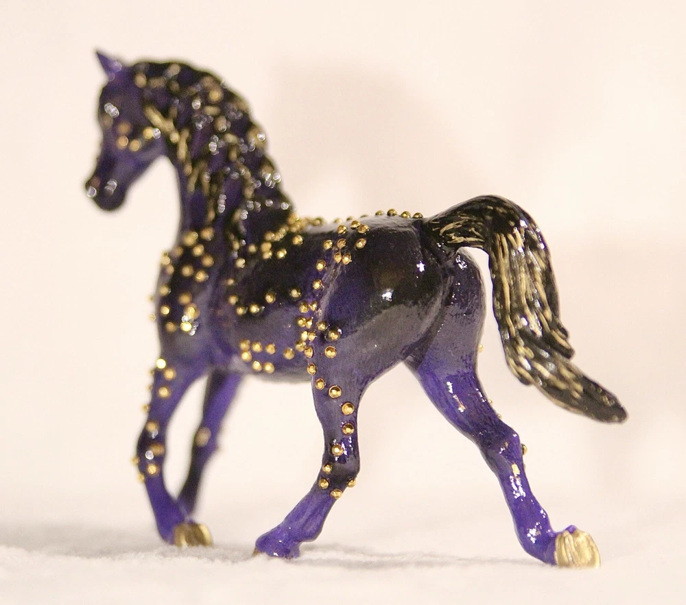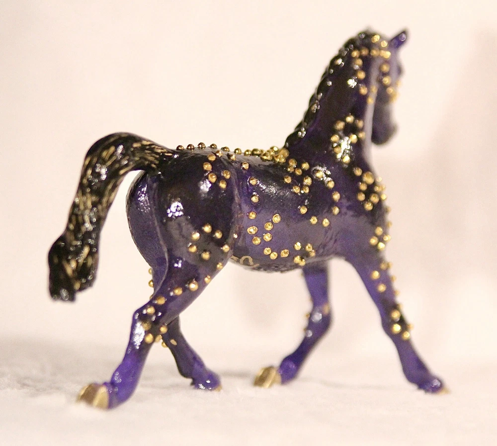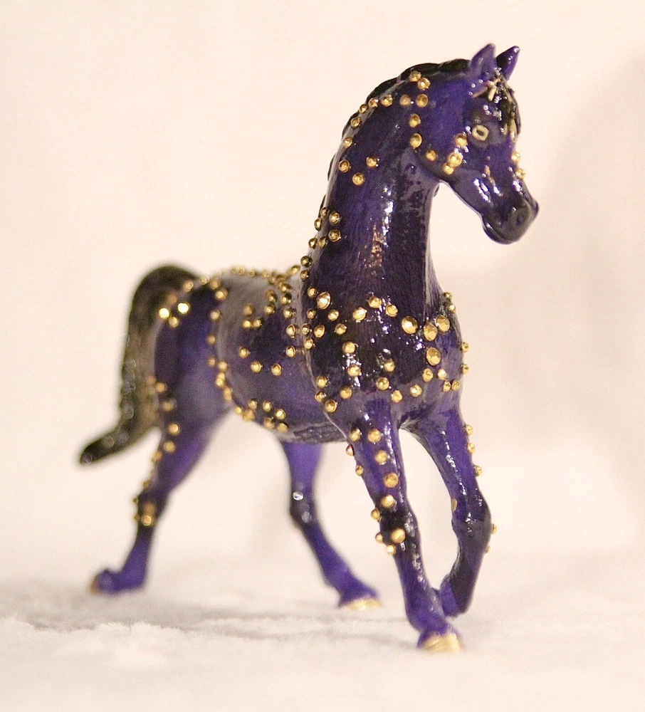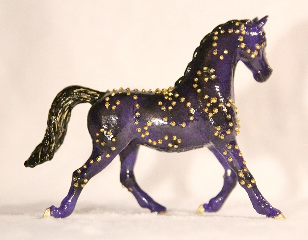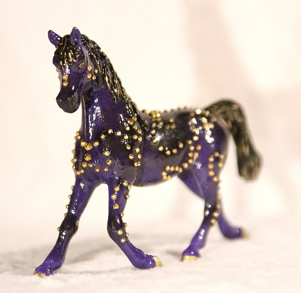 Handmade, one of a kind, detailed model horse (Brand - Schleich) repaint in 1:24 scale. Repainted to be a purple with black fade Arabian mare. She has small gold jewels on her coat, in a swirly design. It’s hand-painted using acrylic paints and pastels. Also is very smooth in texture. It’s sealed with a gloss varnish. All my customs are made with love, hand-painted, and many hours and care put in to each one to make them as realistic as possible. Even though the model is sealed, it is not recommended for rough play. Do not place in water. Comes well packaged to prevent flaws during shipping. Made by It’s a Horse Thing Studios/KaraHorseCrafts.