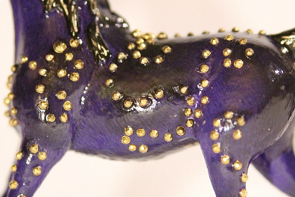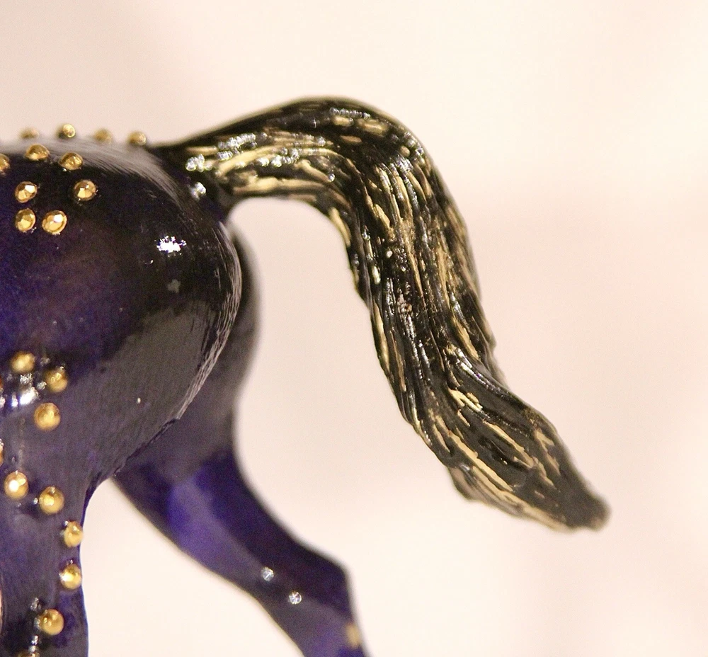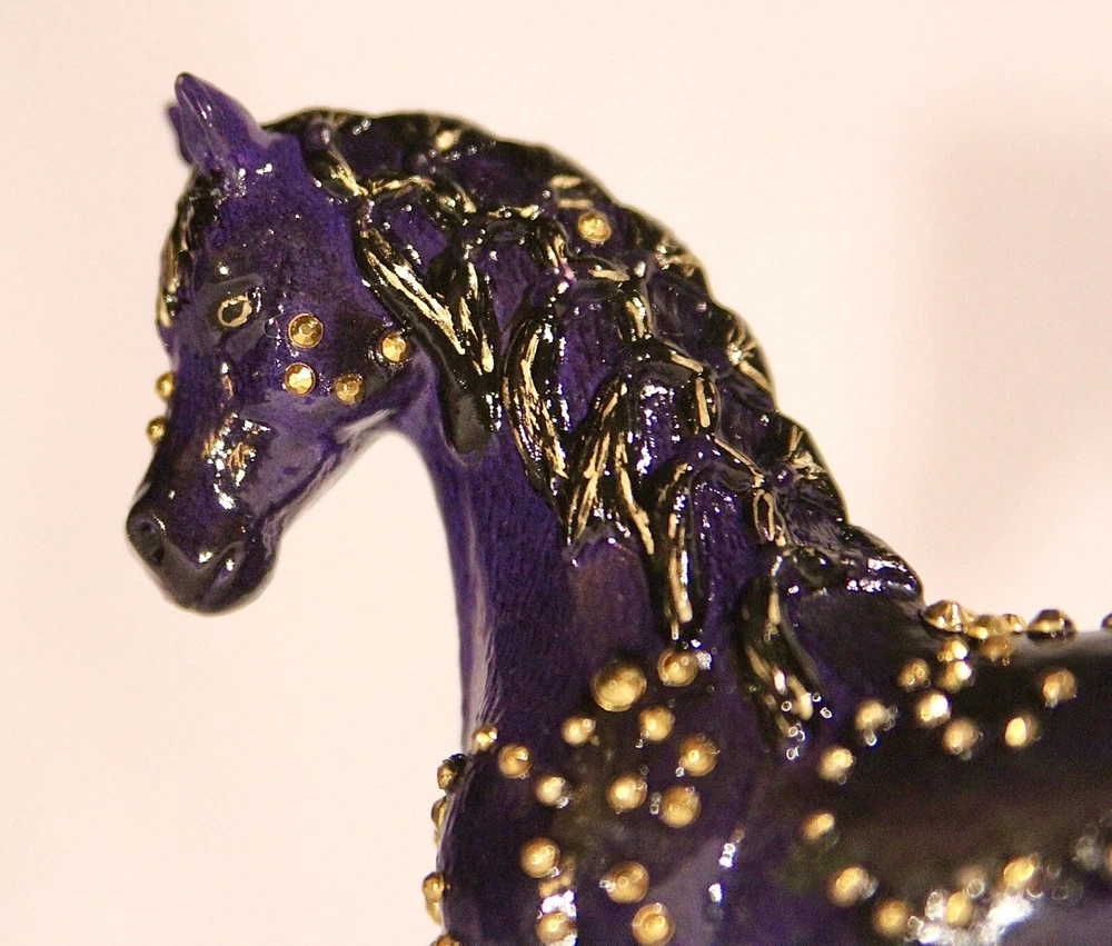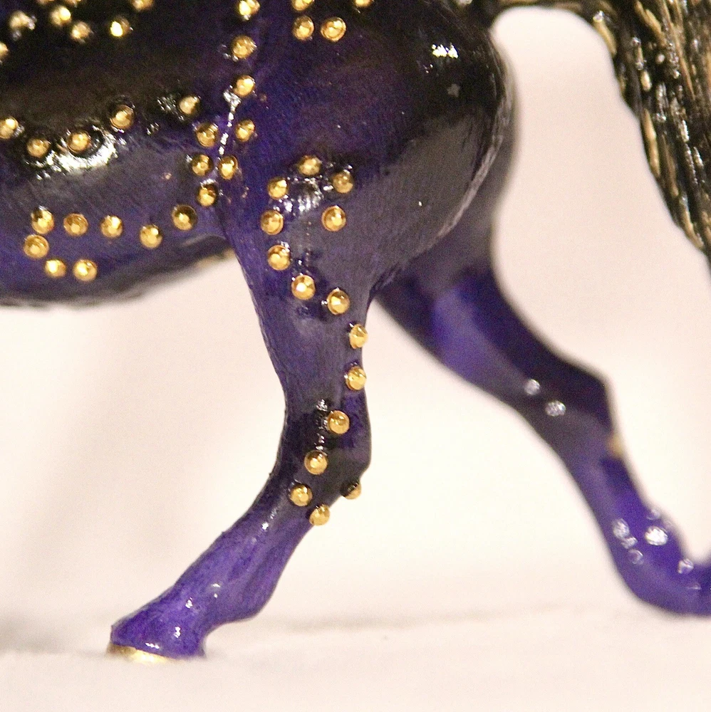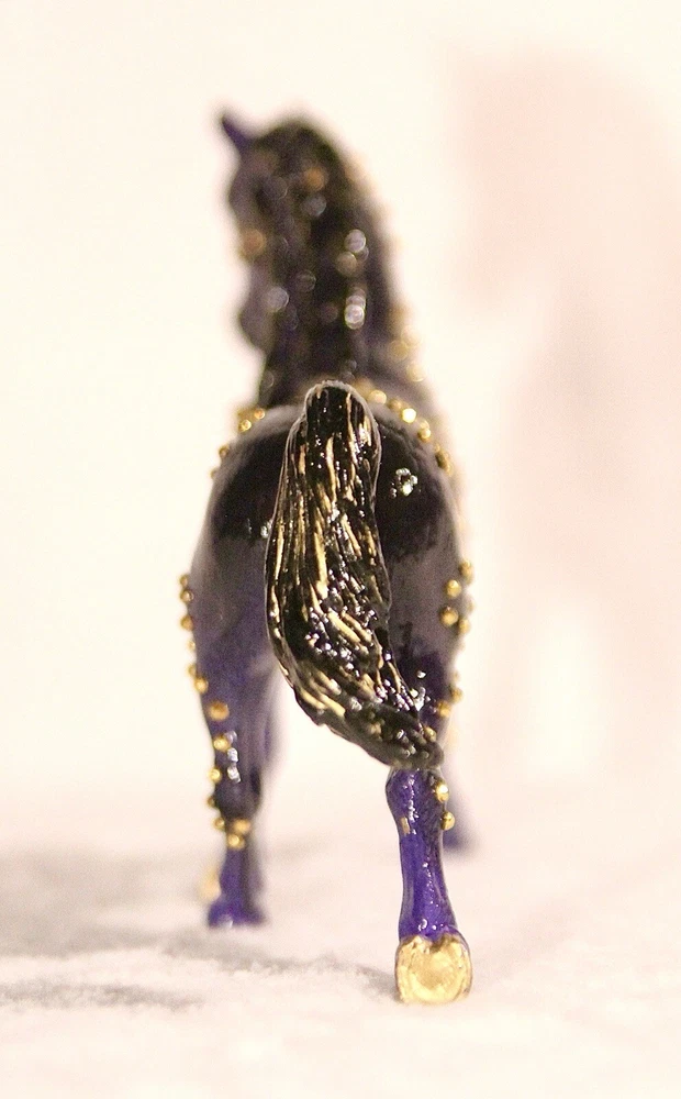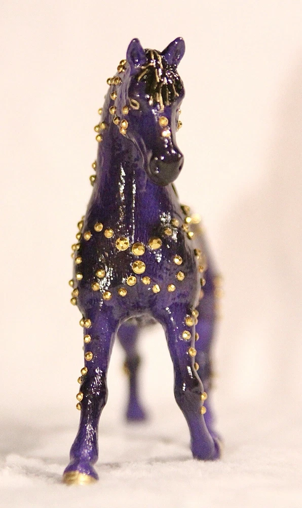 Handmade, one of a kind, detailed model horse (Brand - Schleich) repaint in 1:24 scale. Repainted to be a purple with black fade Arabian mare. She has small gold jewels on her coat, in a swirly design. It’s hand-painted using acrylic paints and pastels. Also is very smooth in texture. It’s sealed with a gloss varnish. All my customs are made with love, hand-painted, and many hours and care put in to each one to make them as realistic as possible. Even though the model is sealed, it is not recommended for rough play. Do not place in water. Comes well packaged to prevent flaws during shipping. Made by It’s a Horse Thing Studios/KaraHorseCrafts.