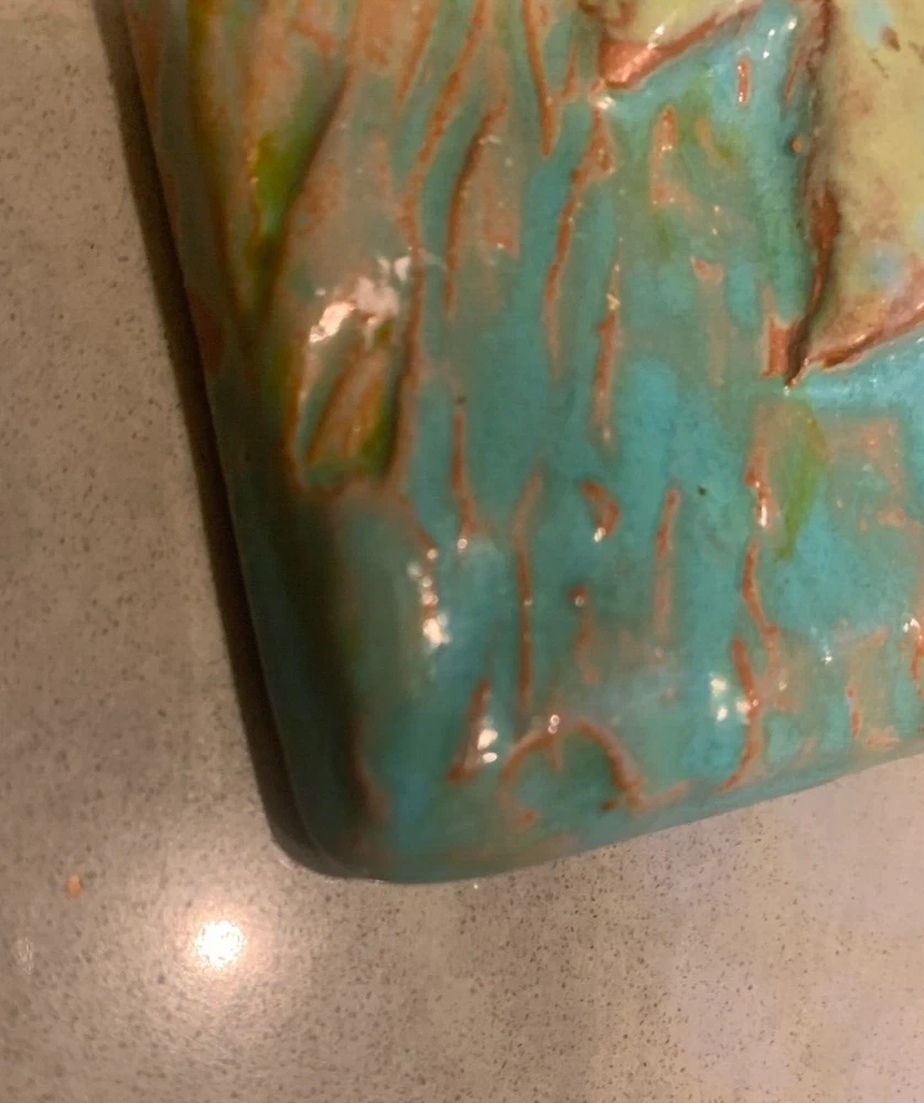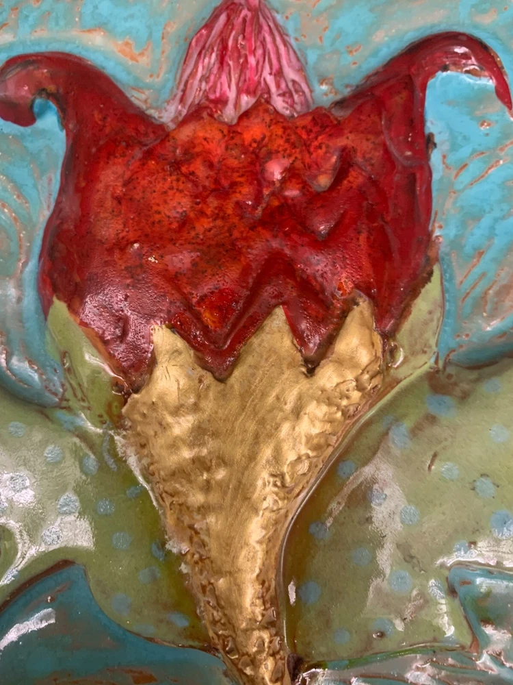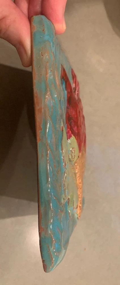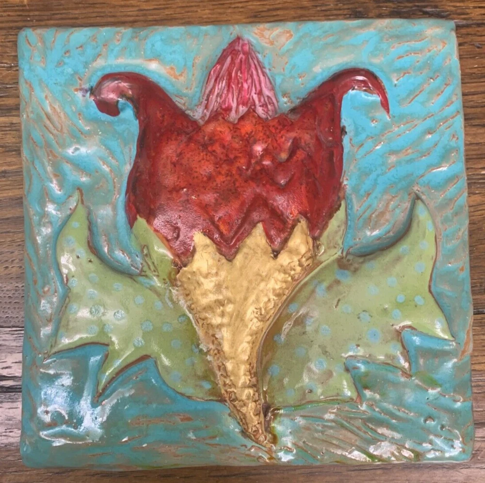 One of a kind beauty! Unique 6 1/4" square tile, high relief art piece with a glossy finish coat. A bold scarlet thistle with gold metallic stem and prickly spotted green leaves is set upon a textured turquoise background. Signed on the back by well-known pottery artist Cathy Kiffney. Hanging hole for a hook or nail. Or display on a shelf or counter. 1" deep at the deepest point. Weighs almost 2 pounds. This is truly a stunning piece. Fast shipping, quality packed, trackable. Thanks for looking :)