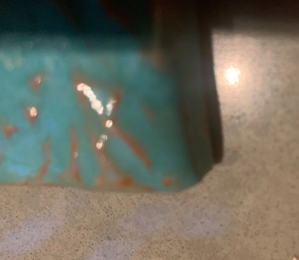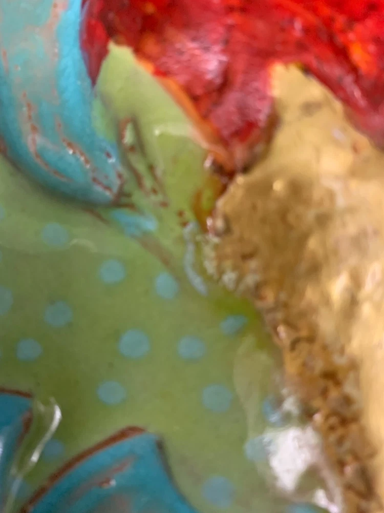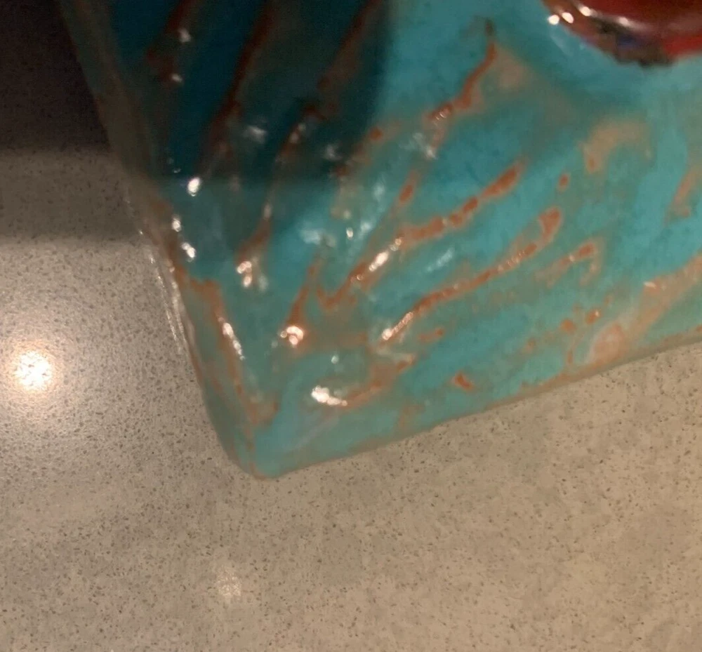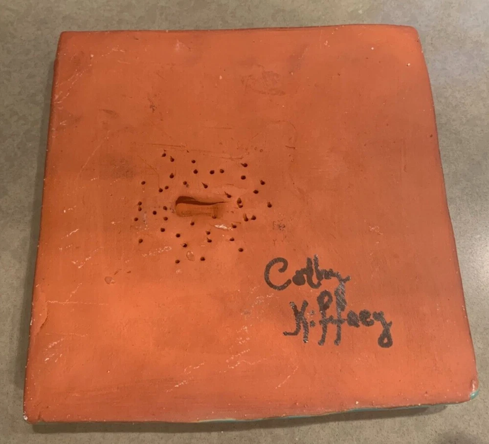 One of a kind beauty! Unique 6 1/4" square tile, high relief art piece with a glossy finish coat. A bold scarlet thistle with gold metallic stem and prickly spotted green leaves is set upon a textured turquoise background. Signed on the back by well-known pottery artist Cathy Kiffney. Hanging hole for a hook or nail. Or display on a shelf or counter. 1" deep at the deepest point. Weighs almost 2 pounds. This is truly a stunning piece. Fast shipping, quality packed, trackable. Thanks for looking :)