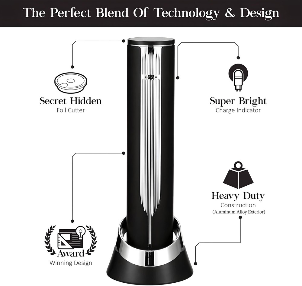 【Quick and Effortless Cork Removal】: Say goodbye to manual cork struggles! Our electric wine opener provides fully automated cork removal, taking just 5-7 seconds to extract corks with precision. Simply position it over the bottle, and let the technology do the work. Ideal for wine enthusiasts of all levels, this gadget transforms the act of opening wine into a seamless and enjoyable experience. 【Crafted with Premium Materials for Durability】: Engineered with high-grade aluminum, our opener ensures long-lasting performance without compromising style. This wine corkscrew is built to withstand frequent use, making it a reliable tool for your wine moments. The premium craftsmanship highlights its luxurious appeal, making it a must-have for any wine gadget collection. 【Elegant Design for Wine Enthusiasts】: Our electric wine bottle opener redefines sophistication, combining a sleek, modern design with luxurious aesthetics. This wine accessory isn't just functional; it's a statement piece that complements any wine lover's collection. Perfect for enhancing the ambiance of wine nights, dinner parties, or as a standout addition to your wine gifts for women or wine gifts for men. 【Rechargeable Convenience with Charging Base】: Powered by a robust 500mAh Li-ion battery, this opener ensures you’re ready to enjoy your favorite bottles at any time. The rechargeable wine bottle opener includes a charging base and USB cable for convenient recharging, with a single charge capable of opening over 60 bottles. Battery level indicators add an extra layer of convenience, making it the perfect companion for gatherings, wine tastings, and celebrations. 【Versatile Features and Stylish Packaging】: Our wine opener comes with an integrated foil cutter and an additional aluminum steel cutter for effortless foil removal. Packaged in an elegant gift box, this opener is perfect for occasions like weddings, housewarmings, and wine tasting parties. Its versatile functionality makes it an ideal addition to any wine gift set or accessory collection. 【Backed by the LINKSTYLE Guarantee】: At LINKSTYLE, we prioritize quality and customer satisfaction. That’s why we offer lifetime technical support and a 1-year warranty covering all mechanical and technical defects. With our commitment to excellence, you can enjoy your wine experiences worry-free. This electric wine bottle opener is the ultimate combination of style, functionality, and durability, making it a standout gift for wine enthusiasts and a staple in any wine accessory collection.