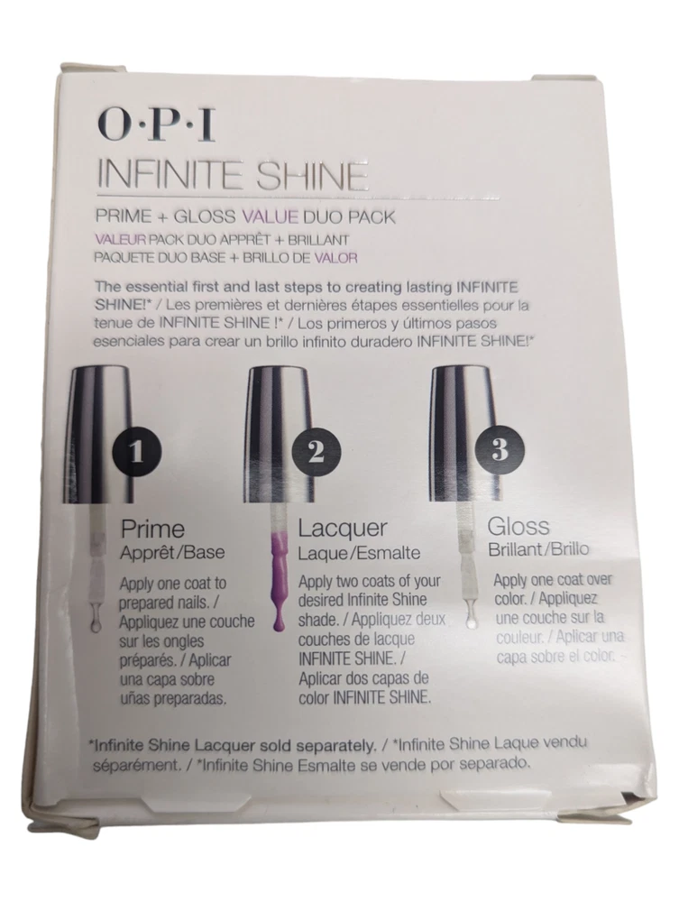 OPI - Infinite Shine - Primer (IST30) + Gloss Top Coat (IST10) Duo Pack Brand new, never used. Includes 1x OPI Infinite Shine Step 1 Primer 0.5 fl oz IST30 1x OPI Infinite Shine Step 3 Gloss Top Coat 0.5 fl oz IST1o Just add your favorite Infinite Shine Polish for Longevity and Shine! Packaging may show minor signs of cosmetic wear and tear due to general warehouse storage. Product is new, unused and not damaged.
