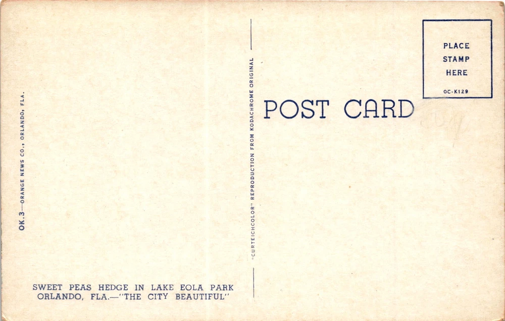 MAKE AN OFFER. THE MORE YOU BUY THE BETTER DEAL I WILL ACCEPT This postcard features a picture of a hedge of sweet peas in Lake Eola Park in Orlando, Florida, known as The City Beautiful. The image is a reproduction in Curteichcolor from a Kodachrome original. The postcard is part of a series identified as OC-K129 by the Orange News Co. based in Orlando, Florida.