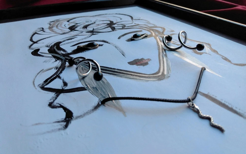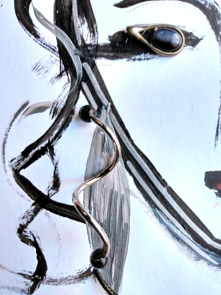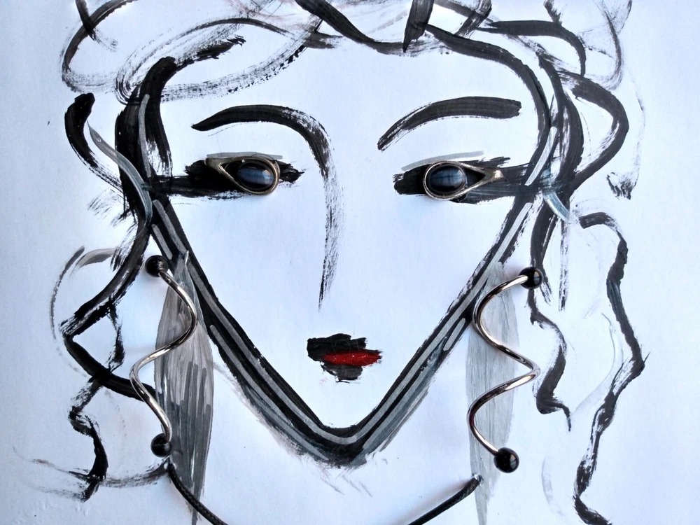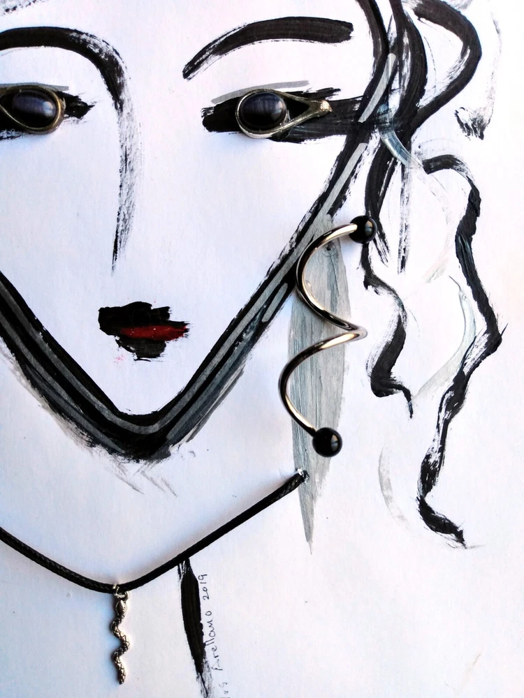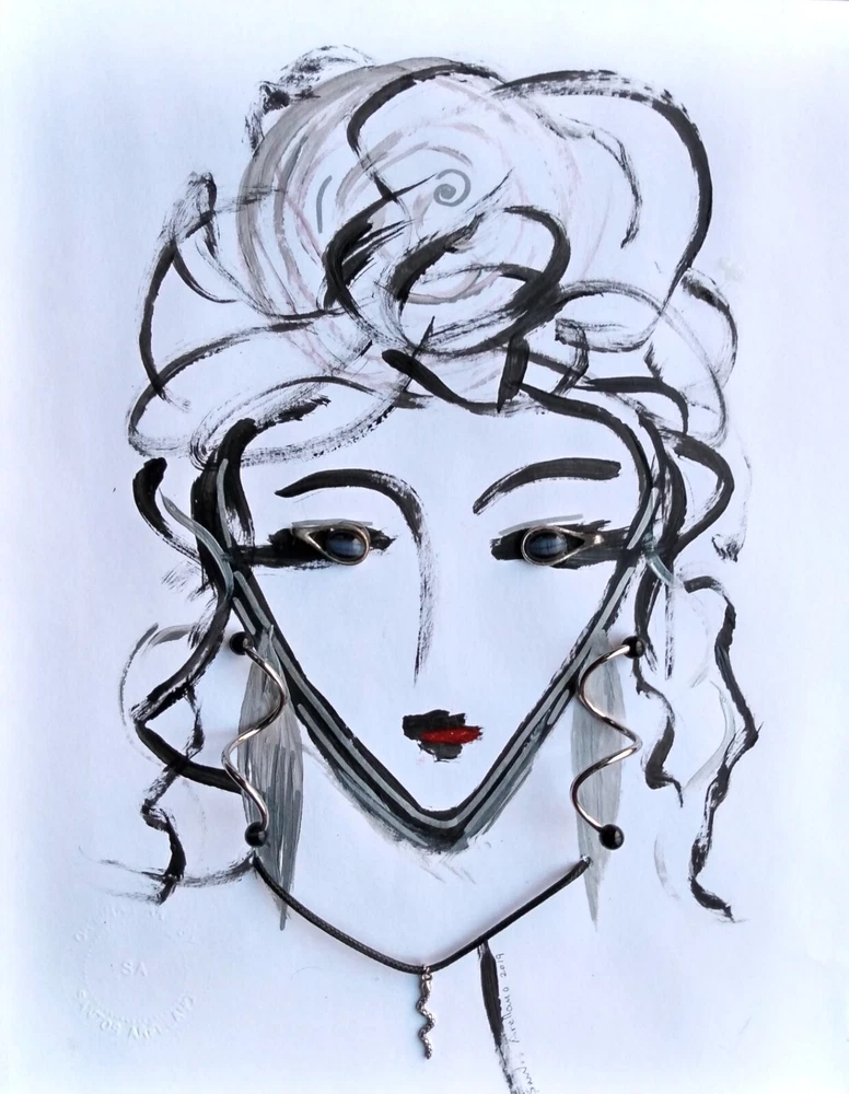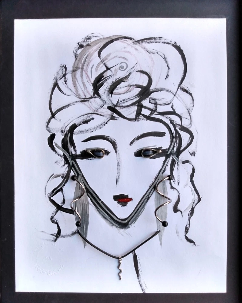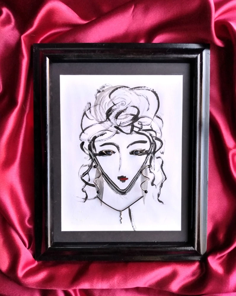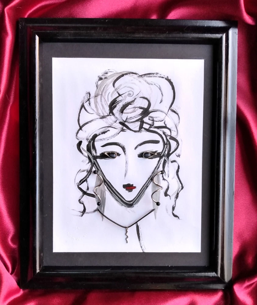 Original abstract art of woman's face done in acrylic paint and art pen. Signed and stamped by the artist. It is embellished with vintage jewelry to create a 3 Dimensional effect. Title - "THE ORACLE" 12" X 15" Framed Art piece - 8" X 11" Jewelry is vintage in silver tones - Eyes are silver tone earrings with black stones Earrings are silver tone with black bead tips Necklace is a silver snake on a black cord Black wood frame / Foam board backing Ready to hang Free Shipping!