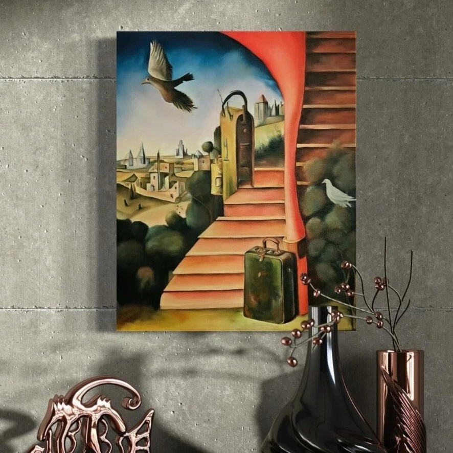 Original oil painting titled "Shift" by surrealist painter Rye Watts. Gallery shown piece. Installed in black oak floater frame. Framed measurements: 21 x 17 x 2" The painting is signed by the artist on front and back and comes with a Certificate of Authenticity. It is wired and ready to hang. All artwork shipped directly from the artist. Title: Shift Artist: Rye Watts Medium: Oil on Canvas Year: 2024 ★ Shipped in heavy cardboard and sustainable paper padding. ★ Shipped with a tracking number. ★ If you have any questions, please message me and I can add photos or video. ABOUT THE ARTIST Rye Watts is a pop surrealist artist based in Portland, Oregon.