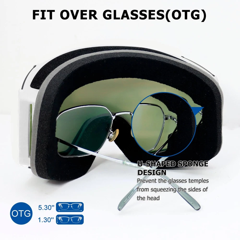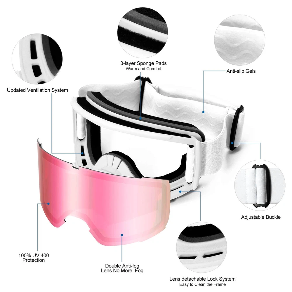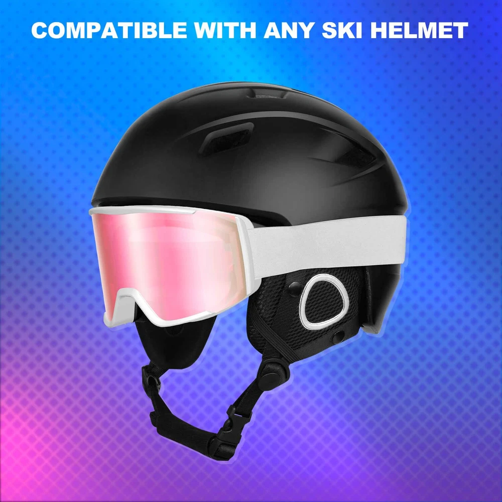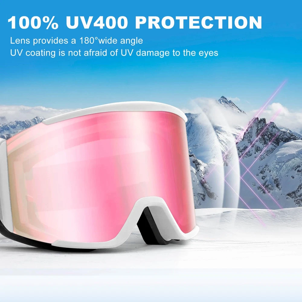 【Double Anti-Fog】-Anti-fog function is the most important function of a ski goggle; ski goggle adopts double-layer lens technology and inner and outer anti-fog coating lens, which provides you with a high-definition and fog-free vision in skiing, and prevents condensation fog 【Helmet Compatibility】-The adjustable elastic headband is helmet compatible and the headband is designed with three non-slip adhesive strips to keep the skiing goggles and ski helmet in place and prevent them from falling off 【Complete Eye Protection】-Snow goggles are made with double-layer PC lenses to ensure sturdiness while blocking 100% of harmful UVA/UVB rays, so you don't have to worry about the effects of harmful sunlight and impaired visibility 【180-Degree Panoramic Design, Smooth Ventilation】-The column lens design effectively reduces spherical aberration and chromatic aberration to ensure a wide field of vision; the air holes at the bottom and top of the snowboard goggles can enhance airflow and accelerate internal air circulation to prevent fogging Snowboarding goggles are suitable for a variety of winter sports, such as skiing, snowboarding, snowboarding, snowmobiling and other sports; they are also a perfect gift for family members & kid or men women & youth