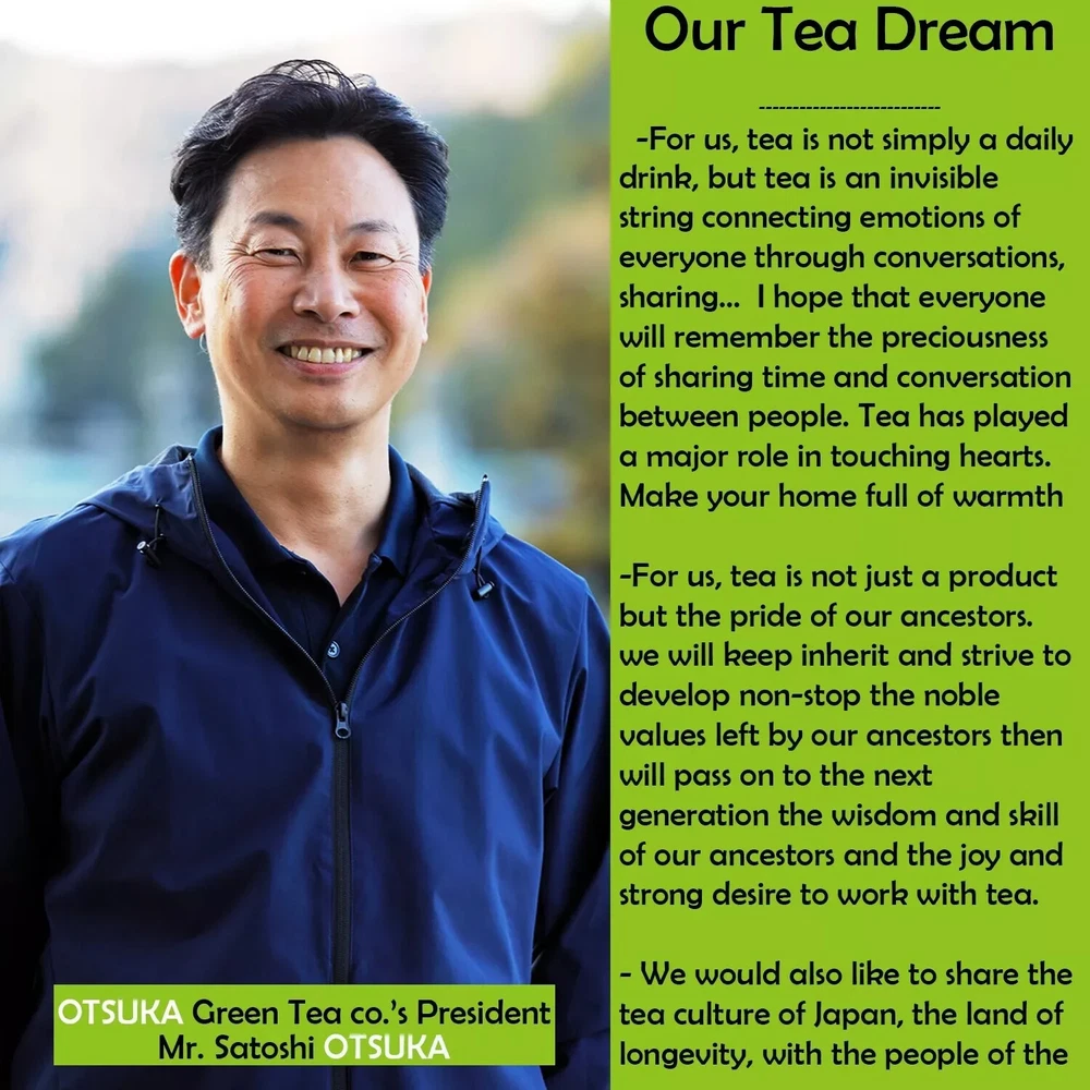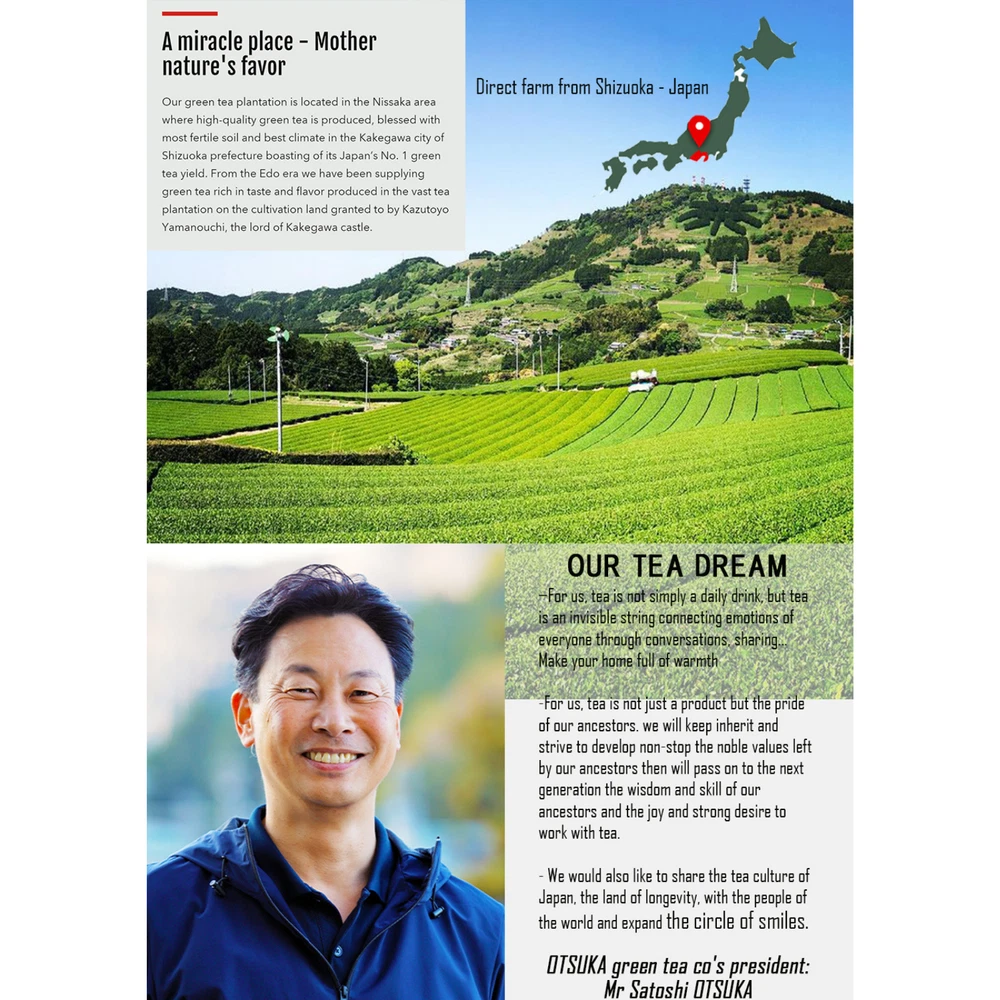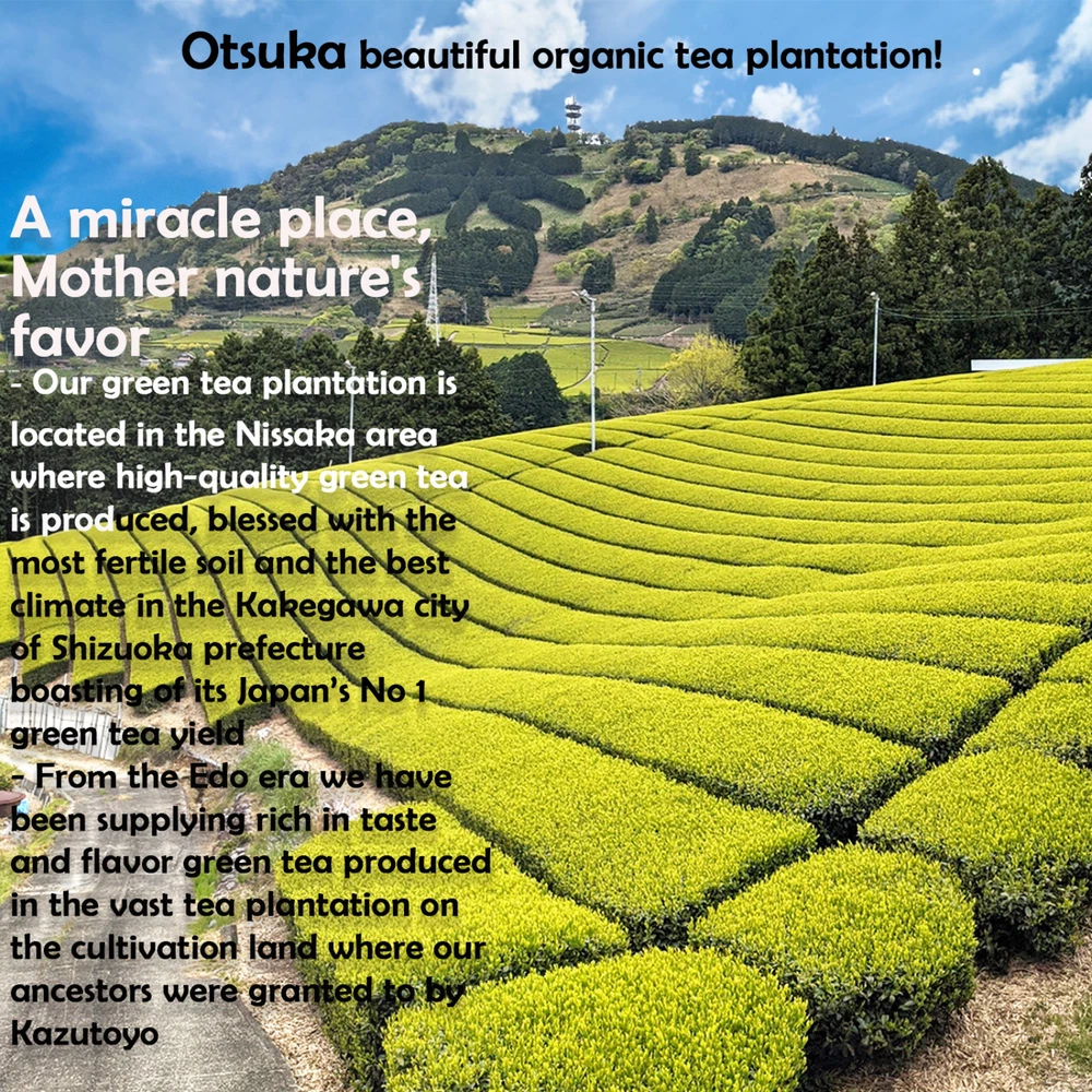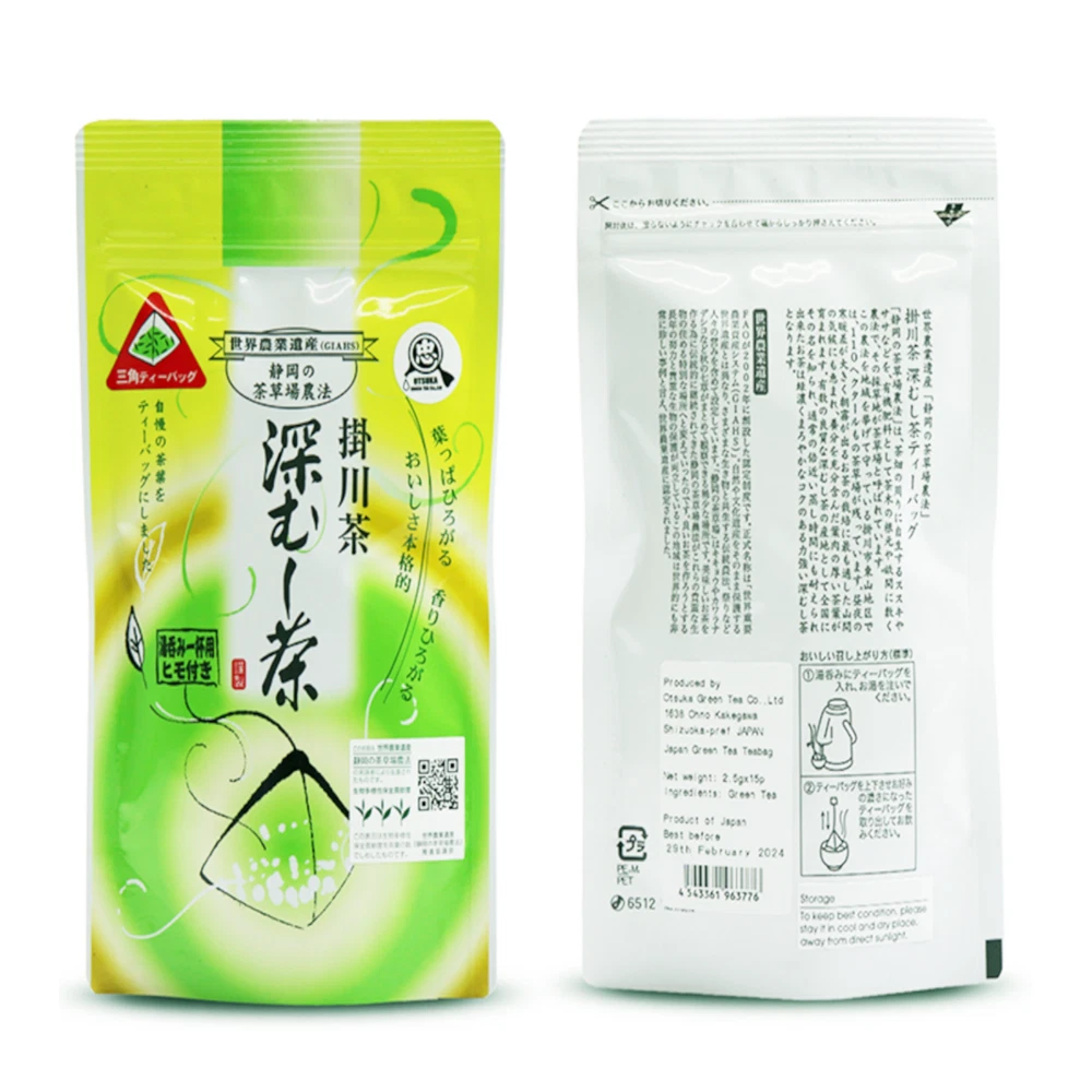 OTSUKA GREEN TEA Co., Ltd. Japanese Kakegawa Tea Fukamushi Tea Tea Bag 2.5gx15p 🍵Kakegawa, Shizuoka, Japan 🍵Made in Japan 🍵Deep Steamed Tea Bag 2.5g x 15p 🍵 Kakegawa Tea Fukamushi Tea Product name: Otsuka Green Tea Co., Ltd. Japanese Fukamushi Tea Bag World Agricultural Heritage Deep Steamed Tea 2.5g x 15p 🍵Brand: Otsuka Green Tea Co., Ltd. 🍵Net weight: 2.5g x 15p 🍵Ingredients: Green tea Fukamushi, meaning "deep-steamed" in Japanese, refers to a specific method of processing green tea leaves. This method involves steaming the tea leaves for a longer duration compared to traditional methods. The extended steaming process results in a finely broken leaf appearance and a deeper, richer flavor profile. This tea is conveniently packaged in individual tea bags, making it easy to brew a perfect cup every time. Each bag contains high-quality green tea leaves sourced from Japan, known for their exceptional taste and aroma. Enjoy the invigorating and refreshing experience of Otsuka Green Tea Co., Ltd. Japanese Fukamushi Tea Bag Deep Steamed, whether you're starting your day or taking a relaxing break. Product Description Deep Steam FukamuSi Sencha Green Tea Bag ( Green Tea Bags 2,5g×15bags ) Deep Steam Tea Bag Otsuka Green Tea green plantation Deep Steam Sencha Green Tea Bag High - Quality Green Tea Leaf Made in Japan 400 Years Long History Tea Company HIgh - Quality Green Tea Bags Sencha Green Tea Bags 2,5g×15bags Use New Technology and Traditional Japanese Method High Qulaity Sencha Great Taste Daily Use Green Tea - Morning Tea Good for Health Otsuka Green Tea Company CEO - Mr.Satoshi Otsuka
