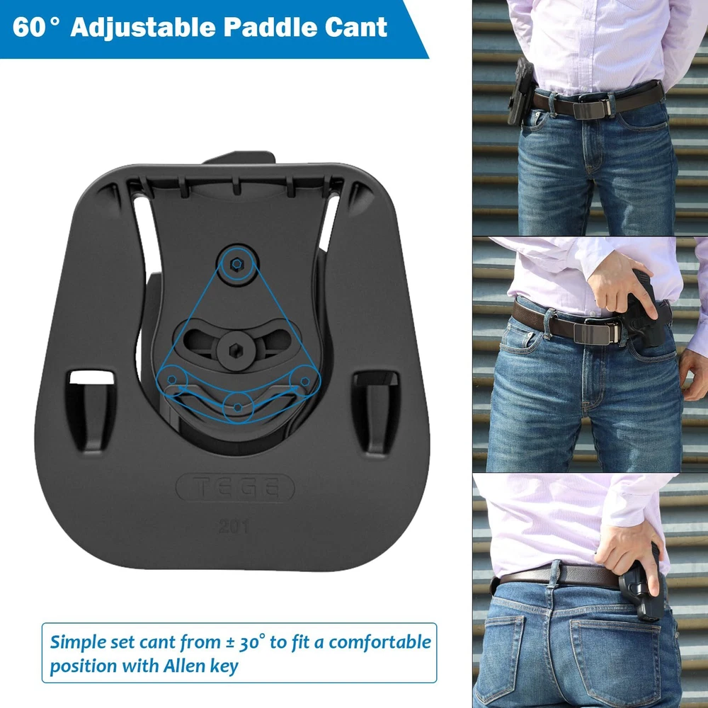 【HOLSTER FIT GUIDE】 Outside the Waistband Holster Custom Molded Fit for Beretta 92 FS 92FS Inox /Compact 92S Full Size/Compact/Centurion M9 M9_22 92G ELITE LTT /Centurion /Compact Taurus PT92 pistol. Notice: This tactical holster can't fit with pistols with laser or sight. (Check the second chart details please) 【LEVEL Ⅱ RETENTION】 Auto locking system achieves an audible click when you holster the weapon, which can secure your weapon inside this OWB holster to ensure ultimate safety. It is designed to be quickly drawn and re-holstered for easier access by pressing release button with your forefinger whenever needed. 【60° ADJUSTABLE PADDLE CANT】 Ergonomically-designed thinner paddle holsters is easily clipped anywhere on your belt or inside the pants waistline, it is convenient to conceal your weapon under your clothing. Simple set cant from 0-60 degrees to fit a comfortable position with Allen key, you won’t have to worry about the firearm digging into your leg the way belt loop holsters can. Compatible duty belt width up to 2 inch. 【MILITARY-GRADE MATERIAL & EXCELLENT DESIGN】 This polymer holster is made of high standard polymer that is waterproof and durable, almost no maintenance required, adapt to every bad environments. The Excellent design of this paddle holster features a wide concave-shaped piece of plastic which works as the backing of the holster, which keeps the firearm away from the hip and ensures a firm grip and the drawing movement is quick and hurdle-free. 【APPLY FOR EVERY PLACES】 Wearing a belt is not a compulsion for using a paddle holster, you can simply tuck it over your waistband, so it is widely used by duty holsters, uniformed law enforcement and peace officers, security personnel, military personnel, private persons and shooting sports holsters all over the world. If you are looking for a gun holster, this is good choice for you.