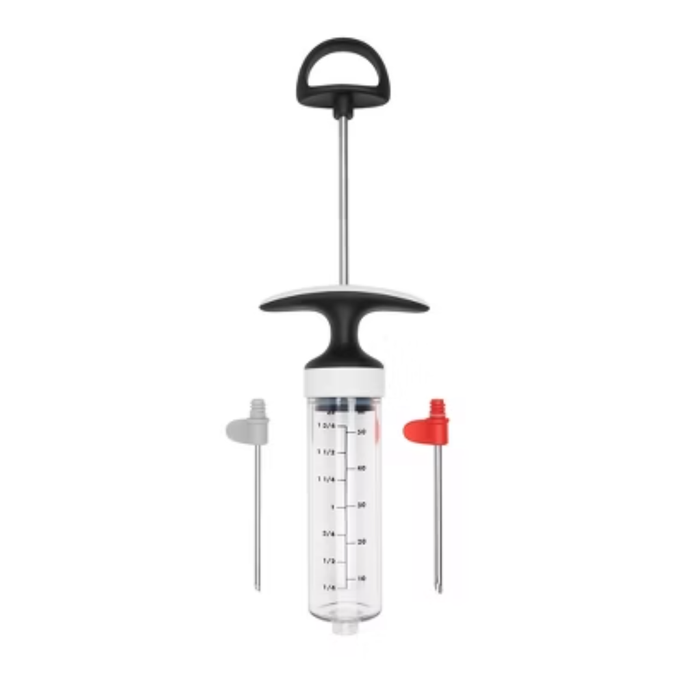 Description Whether you like to season with brines, butter, marinades or minced garlic, add more flavor in less time with the OXO SoftWorks Flavor Injector. Use the comfortable, circular handle to draw your favorite flavors into the BPA-free Tritan body with the plunger. Check the convenient ounce and milliliter measurement markings to pre-load up to two oz of liquid. This meat injector includes two easy-on, color-coded tips. Pick a wide needle for thick marinades and sauces or a narrow needle for melted butter. All parts disassemble for thorough cleaning, and the tips store safely inside the tube. Dishwasher safe. highlights Injects marinades, brines and other flavorings into meat and poultry Large, circular handle is easy to pull and push at any angle Stainless steel needles store inside injector tube when not in use Clear, BPA-free Tritan tube shows marinade level Comes apart for thorough cleaning, dishwasher safe