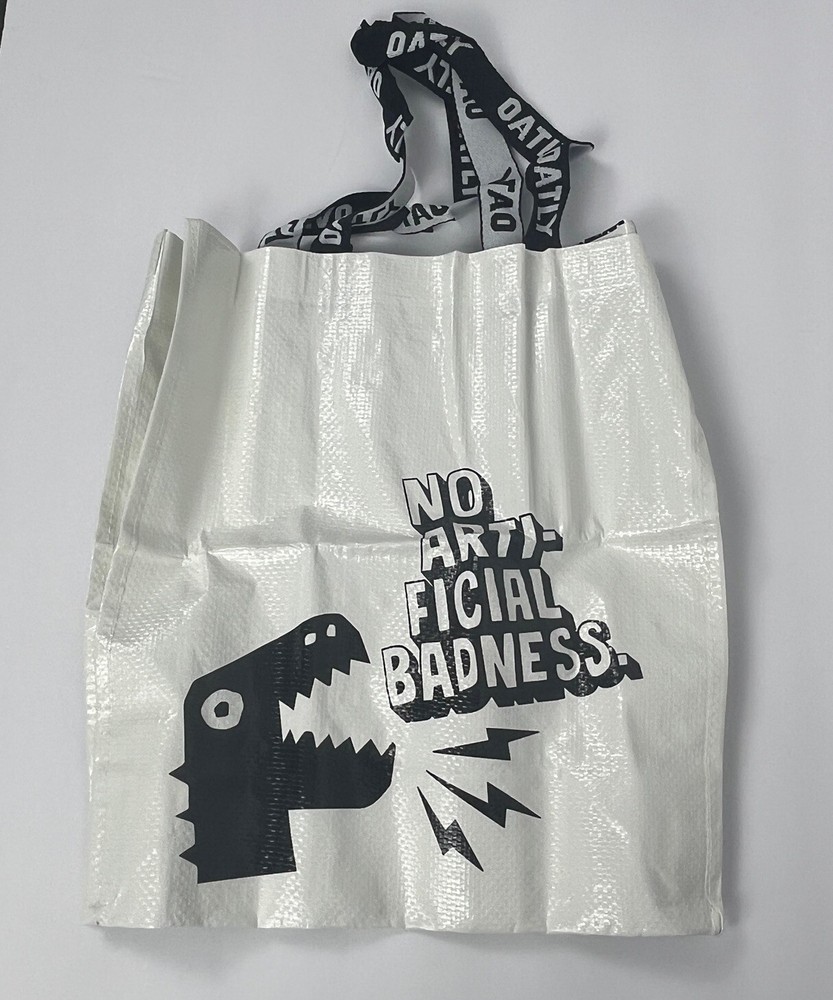 Lot 2 Shopping Tote Reusable Market Shopper Bags Oatly Oat Drink Green and White Totes Dual Straps 14x12x5.5 inches. Packaging opened to take photos.
