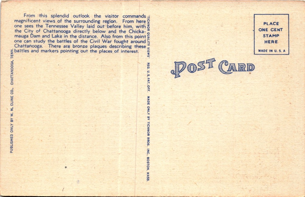 MAKE AN OFFER. THE MORE YOU BUY THE BETTER DEAL I WILL ACCEPT The postcard features the Ochs Memorial Museum Building located on Lookout Mountain in Chattanooga, Tennessee. The building offers a splendid outlook providing magnificent views of the surrounding region. Visitors can see the Tennessee Valley, the City of Chattanooga below, and the Chickamauga Dam and Lake in the distance.