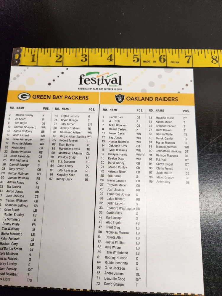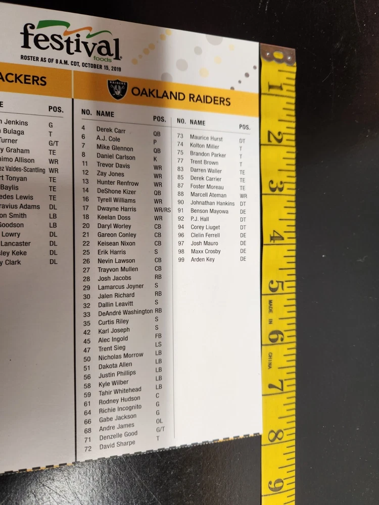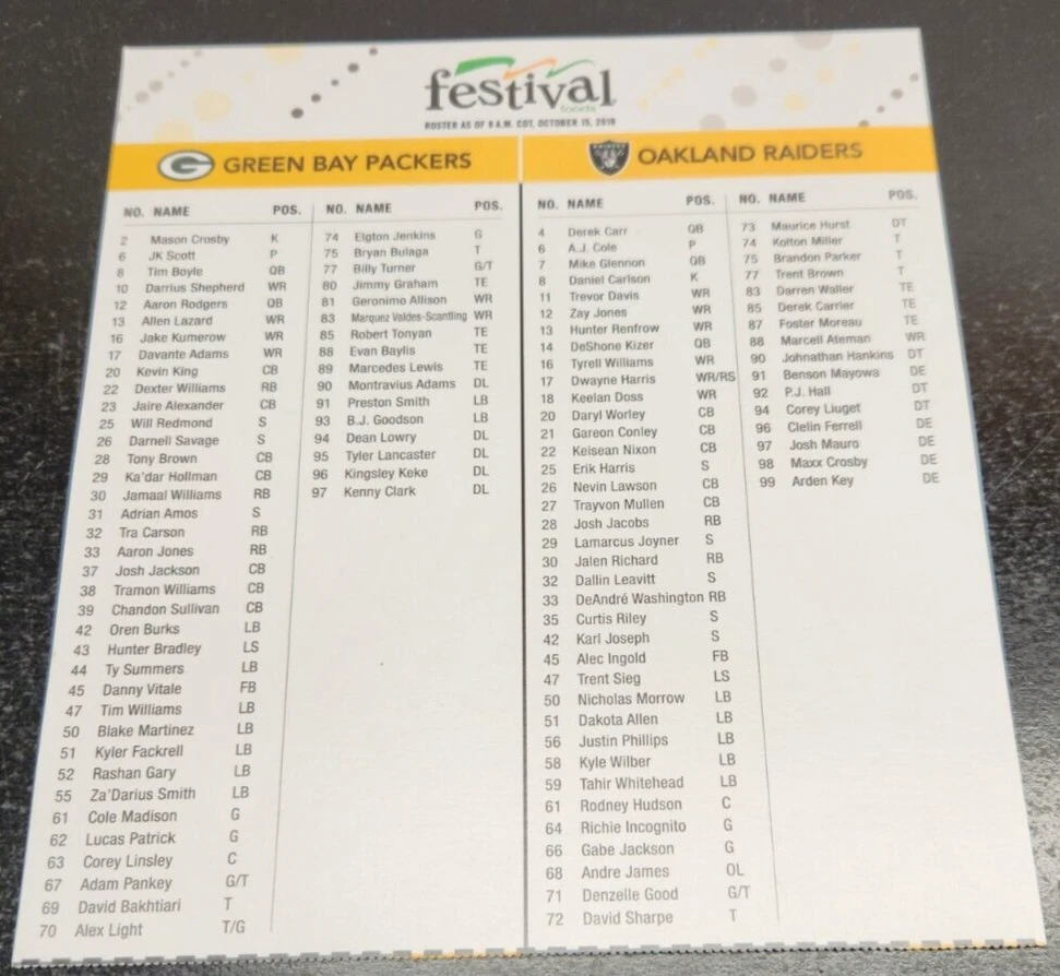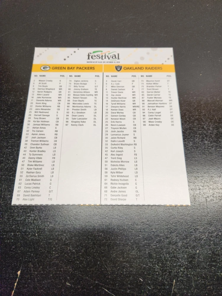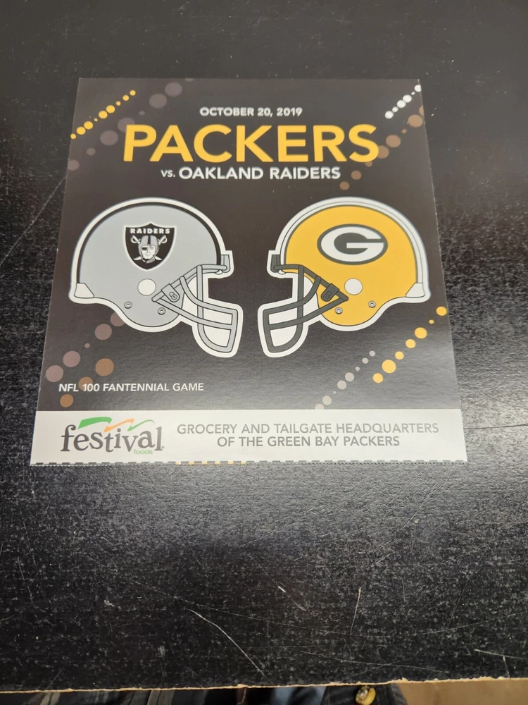 October 2019 Game Day Roster of Green Bay Packers Vs. Oakland Raiders This is a sports collectable. Condition is very good but I have tried to photograph any imperfections. All items are packed safely and sent via US Mail. Paper items are sent in a stiff mailer. Be sure and check out other sports items for sale. I have something from about every team and every sport. Check for new items being posted all the time.