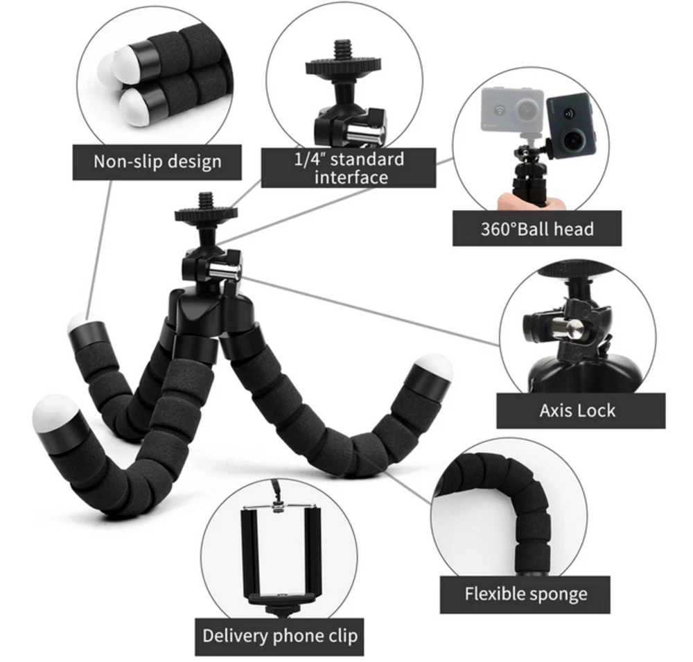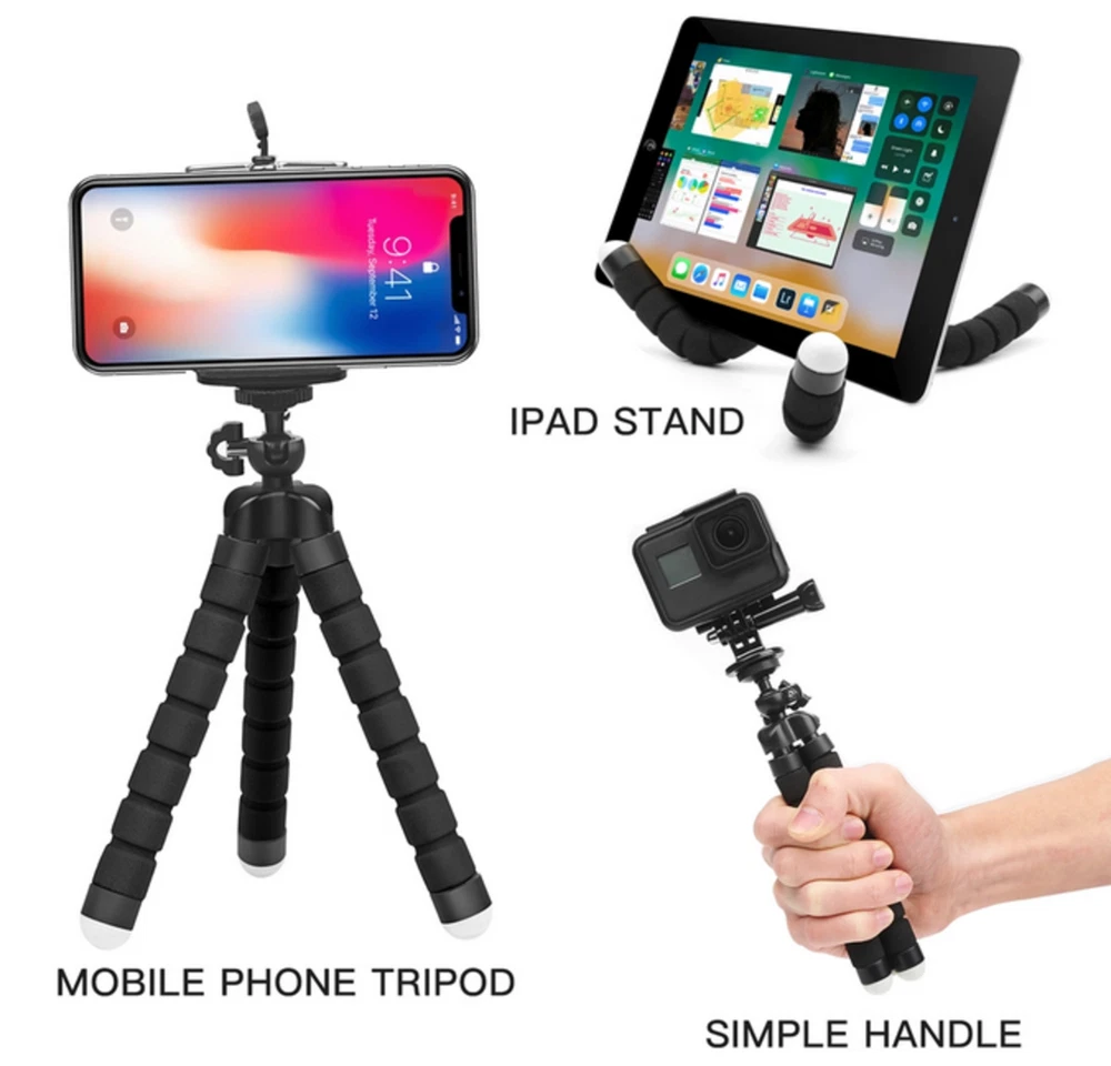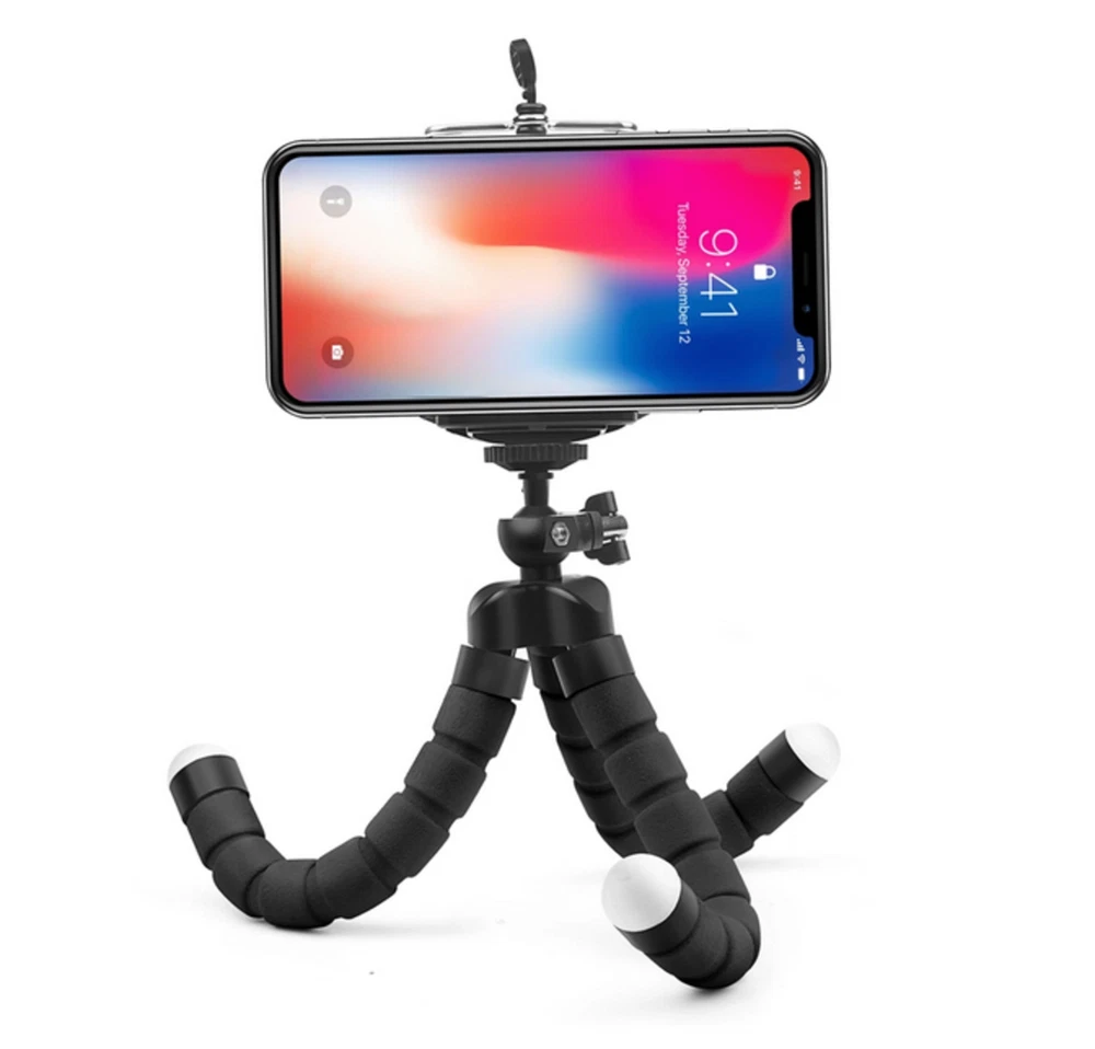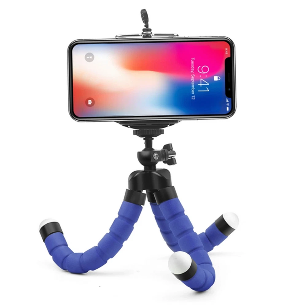 Octopus Adjustable Tripod Stand Flexible Phone Holder for iPhone Camera Bracket 2 BUY, 1 FREE OF CHARGE (3 order) 4 BUY, 2 FREE OF CHARGE (6 order) 6 BUY, 3 FREE OF CHARGE (9 order) 【High Quality】 Mini tripod for smartphone the flexible tripod legs are made of thick premium metal and full metal connector, reinforced with a rubber coating and stable foam. The design with non-slip rubber feet makes the adjustable tripod very stable on desks and floors 【Lightweight and Compact Tripod】 Cell phone tripod's particularly flexible legs allow you to instantly bend them to any angle for effortless setup, and you can even wrap the legs around objects such as railings for added variety in shooting compositions and frames. In addition, this flexible tripod can be aimed with ease for storage or storage in the backpack for travel, hiking or camping or even work as a selfie stick. 【Multi-angle shooting】 The clip and tripod tilt can be rotated 360° degrees, hold your phone in both high, vertical and high angle mode without having to remove the phone. In addition, the 360° rotatable ball joint allows you to control the angle of the phone/camera with gentle movement. · The tripod is very versatile, you can use it normally as a tripod, but also attach it to poles, fences or branches and much more, or you can bend it as a tablet holder. · The head is rotatable and tiltable, the legs are foam-coated and the feet are non-slip. · The included universal mount can be used to mount smartphones with a width between 60 mm and 90 mm. · A camera can also be mounted directly on the 1/4 inch thread. Scope of delivery: 1 x Tripod (Color: depending on your choice) 1 x Universal bracket