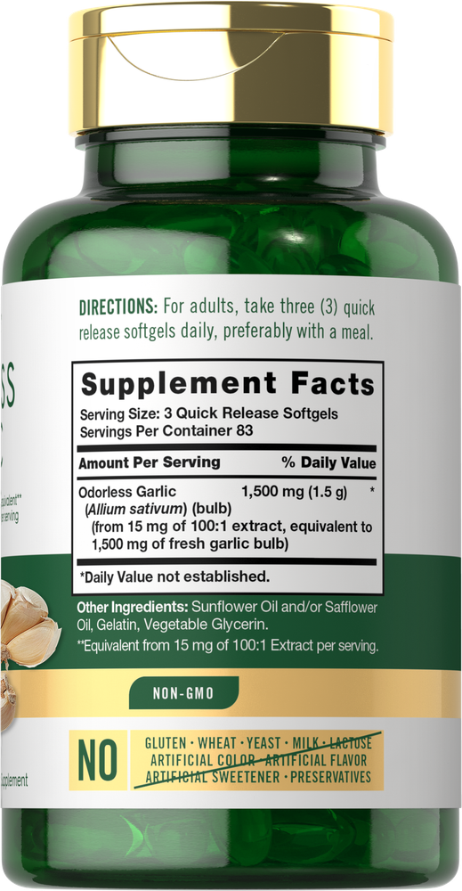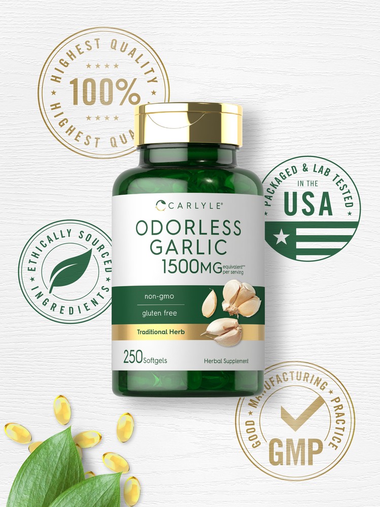 Supplementing with Garlic: Garlic (Allium sativum) is way more than just your favorite food seasoning! This traditional herb contains Allicin, a compound produced when raw garlic is crushed or chopped. Garlic supplements like pills, softgels, powders, capsules, liquid, gummies and tablets are the best ways to get convenient daily support. Carlyle Odorless Garlic: Now enjoy the benefits of Garlic without any harsh taste or odor! At Carlyle, our special formula is made with deodorized Garlic extract, an odorless form that doesn't cause unwanted bad breath. Quick-release softgels deliver the equivalent of 1,500 mg of Garlic per serving, the highest quality source of this spice for your supplement routine. Rooted in Wellness: Our expertise in sourcing the purest ingredients combined with advanced technologies makes us proud to deliver premium, honest supplements at the best value. Carlyle Odorless Garlic is a testament to our commitment to excellence, made with powerful ingredients rooted in wellness. Thanks for choosing us in your pursuit of living healthy. WARNING: Not intended for use by persons under the age of 18. If you are pregnant, nursing, taking any medications, including blood thinners, planning any medical or surgical procedure or have any medical condition, consult your doctor before use. If any adverse reactions occur, immediately stop using this product and consult your doctor. If seal under cap is damaged or missing, do not use. Keep out of reach of children. Store in a cool, dry place.