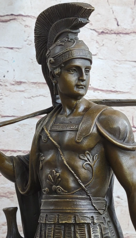 Condition : This sculpture is in perfect condition. Bronze Dimensions with Marble Base: Height 16" X Width 9.5" Marble Dimensions:9.5" X 6" Height without base:15" Weight:18 LBS Inventory:36YRD112310563 The bronze sculpture of a Roman legion soldier depicts a powerful and poignant scene of a warrior amidst a scarred battlefield. The soldier stands nude, adorned only with essential regalia symbolic of his role and status. His galea, or soldier's helmet, crowns his head, while a leather baldric crosses his chest, likely carrying a weapon. A paludamentum, a cloak fastened to one shoulder, drapes down his back, adding a touch of dramatic movement to the sculpture. Captured in a moment of action, the soldier is depicted as if repairing a weapon, showcasing his dedication to readiness and preparedness even amidst the chaos of war. The intricate details of the sculpture, from the soldier's muscular physique to the textures of his regalia, are a testament to the artist's skill and attention to historical accuracy. Crafted using the time-honored lost-wax casting method and finished with a brown patina stain, this bronze sculpture not only honors the legacy of Roman warriors but also stands as a work of art that captures the essence of courage, resilience, and duty. Mounted on a black marble base and signed by the artist Huzel, it serves as a tribute to the enduring spirit of ancient warriors and the timeless appeal of classical artistry. Art Deco Large Odysseus Roman Warrior Bronze Sculpture Marble Base Figure Decor YRD-1123 Video will open in a new window Using the eBay App? Paste link into a browser window: [isdntekvideo]