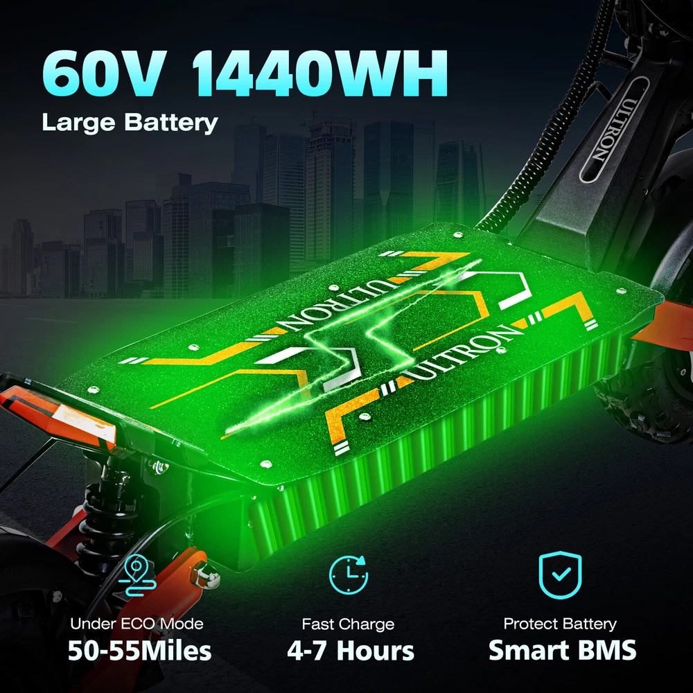Product Detail: Note:If you have any questions, please contact us before open any case, we promise will solve the problem for you. Thanks! Ultron electric scooter adults, established in 2016, is a factory-focused seller primarily engaged in wholesale operations. The company's products have garnered significant attention in the market, especially its electric scooter series, which has gained popularity among consumers. By searching for "Ultron Scooter" on platforms such as YouTube, Tk, FB, and INS, you can find numerous review videos about the brand. About this item 【Big LCD Display & Desigh Concept】This electric scooter has a large LCD display that shows real-time speed (MPH). Such as battery level display, TRIP/ODO/SPEED/, 3 gear modes and cruise indicator.The Adjustable seat can be installed by yourself as needed and comes with instructions and tools. It features an aluminum alloy frame that is recyclable and lightweight. More durable in harsh weather and road conditions. 【Peak 6000W Dual Motor】Electric scooter for adults is powered by dual high-speed peak 3000W powerful motors. A rider weighing 120 lbs (55 kg) can achieve 52 MPH and 50 miles when the battery is fully charged. Sport scooter is a great public transport, this e-scooters is great for commuting to and from work each day. 【1440WH Large Battery】Adult electric scooter features a 1440WH high-capacity battery and reduces charging time to 3-5h with 2 chargers, fully recharges in 5-8 hours with 2 chargers. It has a range of up to 50 miles and an intelligent BMS protection system avording overcharging, overheating etc.The Max Load of this scooter is up to 330 LBS. 【Dual Hydraulic Brakes & EBAS】Our electric scooter is designed for enhanced safety. EBAS and dual hydraulic brake enhances scooter safety, improving the dual braking performance to provide riders with better overall handling. Dual Suspension provides a smoother driving experience and improving comfort. 【360°Light System & 11" Off-road Tires】Adult electric scooter with 11-inch off-road tires traverses a variety of terrain including mountains, beaches, rocky surfaces, and even urban jungles. Dual shock absorber for less bumps on rough roads. Including headlights, colorful side lights, turn signals, and brake lights, ensuring that you can always see & be seen at night for all-around safety. 【Warranty & Service】The electric scooter is 90% assembled so you don't have to waste time with complicated assembly. The seat can be installed by yourself as needed and comes with instructions and installation tools. All electric scooters in the store come with a 200-days warranty.please feel free to contact us, We will reply you within 24 hours and do our best to solve your question. Descriptions: Motor: 60V 6000W(3000*2 dual motor) Battery : 1440WH Charging Time: dual charger 5-8H Max Climbing angle: ≤35-40° Max Speed & Range : 52MPH/50Miles Wheel Size : 11Inch Tubeless Tire Brake: Dual Hydraulic Brake Scooter Weight: 40KG/88lbs What package includes? 1 × electric scooter 1 × handlebar bag 1 × seat & pump 1 × tool & mannual 2 × chargers & keys Note: 1. Please allow minor deviation due to manual measurement. 2. Due to the difference between different monitors, the picture may not reflect the actual color of the item. 3. Communication is the best way to solve the problem. If you have any problems after purchasing, please contact us in time, before opening return or case. Payment: We accept PayPal ONLY currently. Payment must be made within 3 business days. Shipping: 1. Item will be shipped within 1-5 business days from CN Stock or US Stock according to the item location. 2. Sometimes the ship date will be delayed due to a shortage. We will inform you via message. 3. Please leave available address and phone # in delivery information. Seller are not responsible for wrong address. 4. Please indicate your personal requirement such as colors, packages, value of declaration etc. at PayPal's message when make payment. 5. We will NOT responsible for any delay during delivery including but not limited to customs postage checking, strike, force measure etc. Customs Declaration: Import duties, taxes and charges are not included in the item price or shipping charges. These charges are the buyer’s responsibility. Please check with your country’s customs office to determine what these additional costs will be prior to biddingying. Return & Refund: Returns are accepted within 30 days. Please read the item description and check the pictures carefully before bidding. Return or refund is available only if item DOA or there's error in item description causing the item not fitting your need. In such cases, seller pays for all related shipping cost if any. Returns are also acceptable if buyer purchased this by mistake and item still in good condition for reselling. Buyer is responsible for all related shipping cost. Feedback: As long as you are happy with your purchase, please kindly leave us for it is very important for our store performance. If there is any problem with your order, please contact us and give us a chance to resolve your problem Before leaving us a negative feedback.