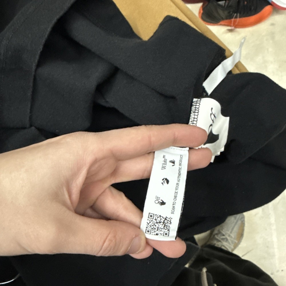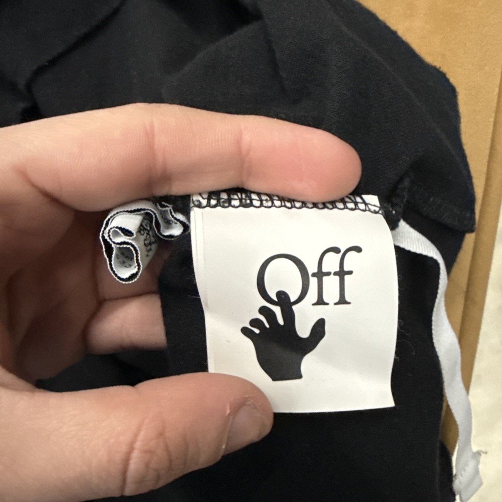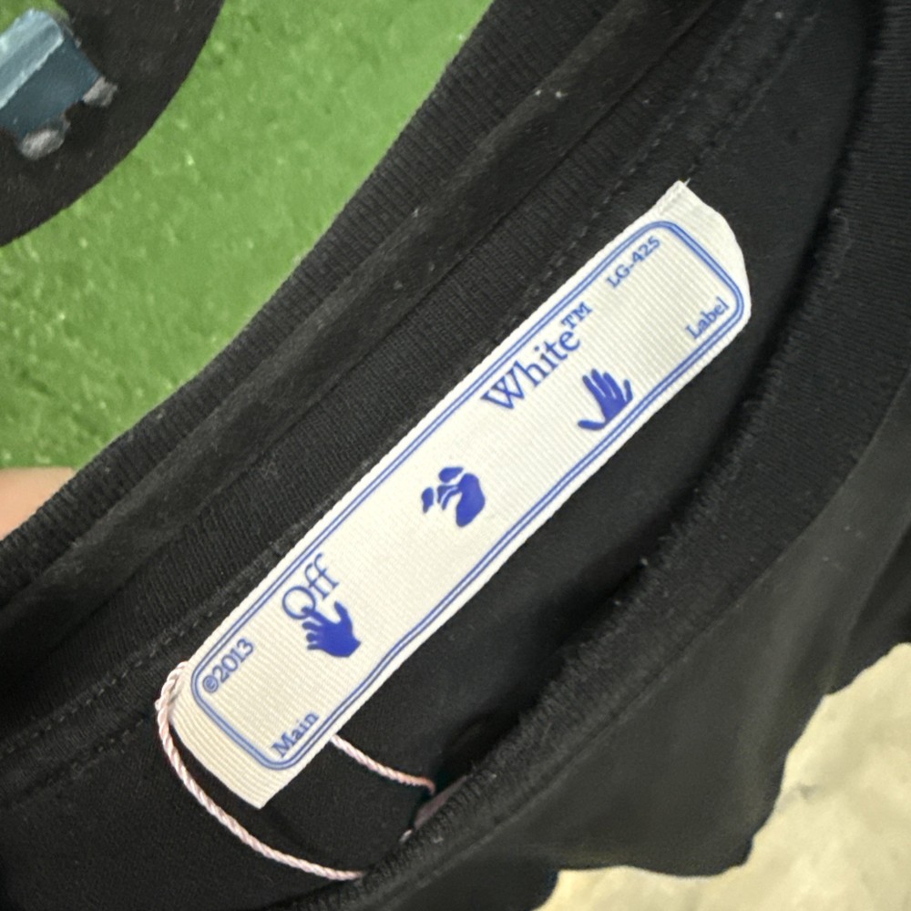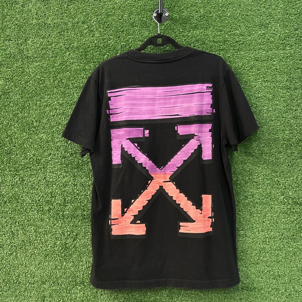 The Off-White Marker crew-neck cotton T-shirt in size L features a graphic print pattern with a black color and a logo accent. This short sleeve shirt is made of cotton and is machine washable. Designed by Off-White, the regular fit shirt is suitable for men and is part of the Gildan 5000 product line. Perfect for summer and spring seasons, this T-shirt is a stylish and trendy addition to any man's wardrobe, representing the designer theme of the brand.