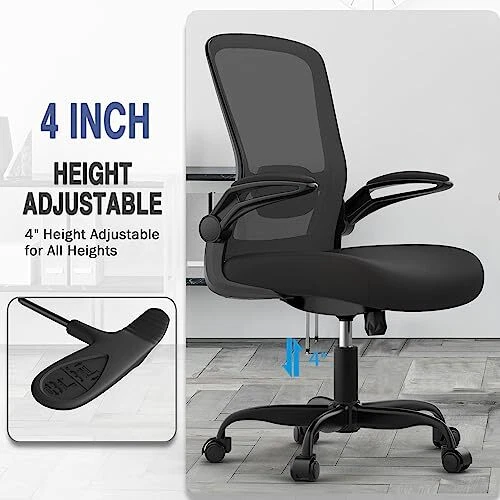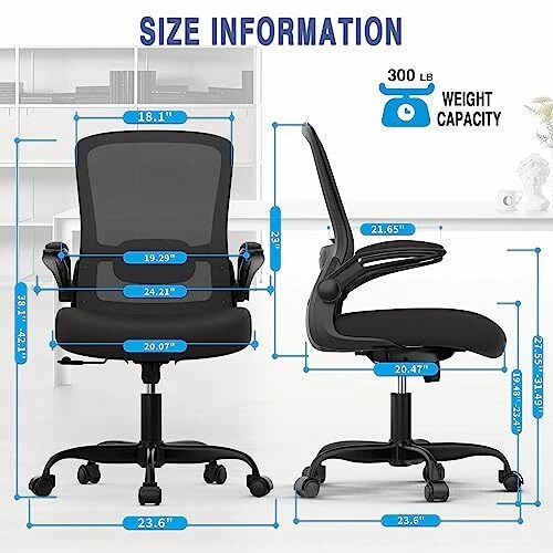 Return Policy Fast Delivery Trusted seller Office Chair, Comfy Desk Chair with Adjustable Lumbar Support, High Back Mesh Ergonomic Computer Chair with Flip-up Armrests-BIFMA Passed Task Chairs, Executive Chair for Home Office Product Description 【ERGONOMIC DESIGN OFFICE CHAIR--Improve Your Posture】The design of the backrest fits the shape of the human spine, with the adjustable lumbar support, the office chair will give your back strong support. And the thick seat also can relieve the hip pressure to offer you comfort. Thick padded back & seat take this chair to the next level of comfort. Choose this office chair, choose comfort. 【ADJUSTABLE DESK CHAIR--More Comfort】This task chair has a 4 inch lifting range to meet the needs of people of different heights, it also has a reclining function of 90-135 °which allows you to relax yourselves after work. This mesh computer chair with flip-up armrest and seat height adjustable means you can find the perfect position to ensure you a pain-free day for long hour sitting. 【HIGH QUALITY MATERIAL--Work is Easier】Certified by BIFMA and SGS. Office Chairs have Soft High-density form Seat, which is covered with durable breathable mesh fabric and has good elasticity and difficult to deform to keep comfort for longer hours. Height-adjustable GAS LIFT CHROMED, Heavy-duty base and nylon smooth-rolling casters for great stability and mobility to help promote a comfortable seated position, keeping you comfy after long hours of game or work at home. 【SPACE SAVING】The simple style of the mesh office chair adapts ideally to any office furniture, especially in living rooms, bedroom, kitchen, study and office, and can be used in a variety of ways, you can flip the arms up and put it under the desk for saving space. 【WORRY FREE & Perfect Gift Idea】360 degree swivel, made of heavy-duty noiseless casters, its explosion-proof base plate with a 5-star base increases safety and stability. Maximum capacity up to 300LB desk chair. We Guarantee our customers 100% satisfaction with our premium desk chair! If you’re not satisfied with this executive chair, just email us and get a solution WITH NO EXCUSE! Shipping Returns Payment Shipping Shipping is FREE to all addresses other than APO/PO boxes in the lower 48 states. All our stock ships from US-based warehouses. Shipped via USPS or UPS (depending on location and package weight) Unless stated otherwise, all orders will ship within 24-72 hours of your payment being processed. Check our feedback to see the great reviews of FAST shipping we offer. Returns Seller does not accept returns Payment We currently accept payment via eBay managed payments only. Once payment is cleared, we will dispatch your shipment within 1-3 business days. Please refer to the "Shipping" tab for more information regarding shipping speed to your destination.