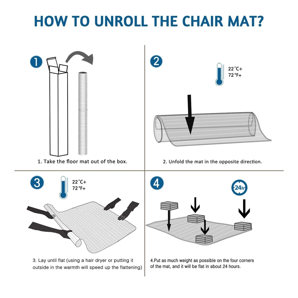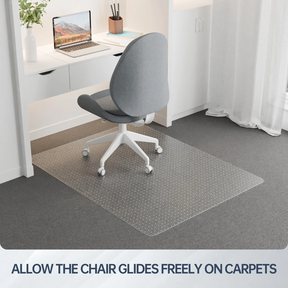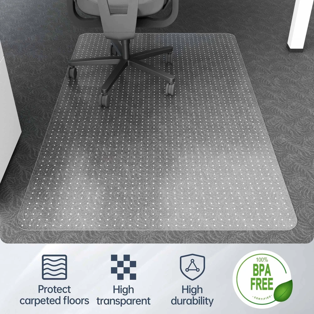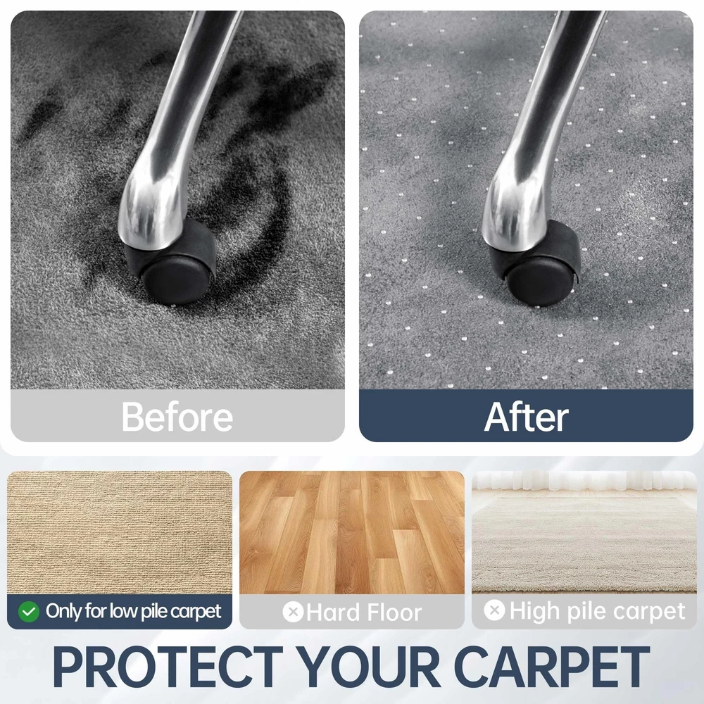 Office Chair Mat for Carpeted Floors, 48" x 30" Low Pile Carpet Protector for Desk Chair, Sturdy Clear Plastic Floor Mat for Rolling Chairs (Rectangle) Product Details Size: 30" x 48" Color: For Low Pile Carpet Brand: Futurwit MPN: Does not apply UPC: Does not apply EAN: Does not apply Material: Polyvinyl chloride Brand: Futurwit Size: 30" x 48" Color: For Low Pile Carpet Style: Modern Shape: Rectangular Product Dimensions: 48"L x 30"W x 0.09"Th Surface Recommendation: low pile carpet Corner Style: Rounded Manufacturer: Futurwit Material: Polyvinyl chloride Brand: Futurwit Size: 30" x 48" Color: For Low Pile Carpet Style: Modern Shape: Rectangular Product Dimensions: 48"L x 30"W x 0.09"Th Surface Recommendation: low pile carpet Corner Style: Rounded Manufacturer: Futurwit Item Weight: 6.3 pounds Country of Origin: China Date First Available: May 22, 2024 LONG LASTING PROTECTION FOR YOUR CARPET: Office chair mat protect your carpet from damage caused by chair casters rubbing, scratches or dirt, and keep your office area clean and tidy. PREMIUM PLASTIC MATERIAL: The desk chair mats are made of durable PVC with a thickness of 2.2mm, scientifically designed for hardness, they will not curl after unfolding and have a high resistance to cracking. STRONG GRIP: The back of the chair mat for carpets comes with 5mm nails to hold the office mat for carpet firmly to the carpet. Suitable for low pile carpets up to 1/4" pile height. HIGH TRANSPARENCY: Office mats for rolling chairs made of highly transparent material, won't cover the beautiful carpet, won't yellow with long term use, daily cleaning is very simple, just wipe with a damp cloth. MULTIPLE SPECIFICATIONS AVAILABLE: We have a wide range of floor mats with various specifications, whether it's a carpet or hard floor option, you can find the right sized chair mats.