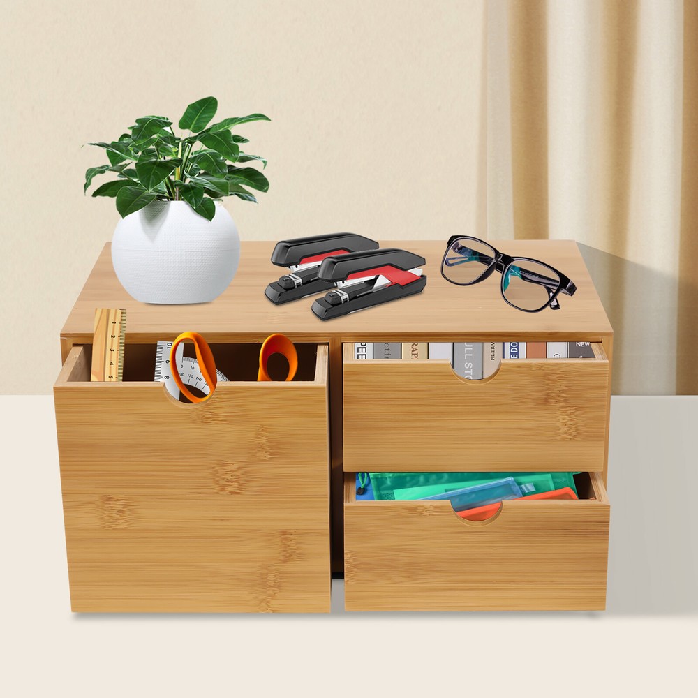 Application It Is Suitable for Sorting and Storing Stamps, Sticky Notes, Paper Clips, Scissors, Bills, Pens, Pencils, Business Cards, Notepads, Cosmetic Collection, Toiletries, Jewelry, Hair Accessories, Crafts, Kitchen Pantry Supplies, Letter Mail Sorter, Computer Tech Gadgets, Etc in the Home, Office, Store, Etc. Specification Color: Wood Color Material: Bamboo Shape: Rectangular Style: Retro Number of Drawers: 3 Mounting Type: Desktop Placement, Freestanding Net Weight: 2kg/4.4lbs Gross Weight: 2.1kg/4.6lbs Package Size: 34*20*18cm/13*7.8*7inch Product Size: 33*19*16cm/12.99*7.48*6.3inch Package Included 1* Bamboo Desk Organizer WELCOME Description Do You Want to Say Goodbye to Clutter and Improve Your Quality of Life? Then You Cannot Miss This Product. the Bamboo Desk Organizer Is Harmless , Odorless , and Environmentally Friendly . It Has a Large Size and a Total of 3 Drawers, Allowing You to Sort and Store Your Items According to Your Needs, Organizing Your Desktop to Restore Neatness. Application It Is Suitable for Sorting and Storing Stamps, Sticky Notes, Paper Clips, Scissors, Bills, Pens, Pencils, Business Cards, Notepads, Cosmetic Collection, Toiletries, Jewelry, Hair Accessories, Crafts, Kitchen Pantry Supplies, Letter Mail Sorter, Computer Tech Gadgets, Etc in the Home, Office, Store, Etc. Specification Color: Wood Color Material: Bamboo Shape: Rectangular Style: Retro Number of Drawers: 3 Mounting Type: Desktop Placement, Freestanding Net Weight: 2kg/4.4lbs Gross Weight: 2.1kg/4.6lbs Package Size: 34*20*18cm/13*7.8*7inch Product Size: 33*19*16cm/12.99*7.48*6.3inch Package Included 1* Bamboo Desk Organizer Key Features High-quality Material: This Product Is Made of High-quality Bamboo, Which Is Natural, Harmless , Odorless , Environmentally Friendly , Water-proof , Crack-resistant , and Wear-resistant . Retro Style: the Wood Color, Natural Texture, and Classic Design Make It Look Vintage. It Can Blend in with Different Decor Styles and Add Color to the Space. Large Storage Capacity: This Product Has a Size of 12.99*7.48*6.3inch, Which Is Large Enough for You to Use. It Has a Large Drawer and 2 Small Drawers, Allowing You to Sort and Store Items According to Your Needs. Desktop Tidy Assistant: the Large Storage Capacity Can Effectively Categorize and Store Your Desktop Clutter, Making the Desktop No Longer Cluttered, Which Is a Good Helper for Desktop Tidiness. Good Stability: the Thickened Material and Rectangular Shape Make It Have Good Stability, Allowing You to Use It Without Worrying About It Shaking and Tipping. Without Assembly Required: This Product Doesn't Need Assembly and You Can Use It Directly After Receiving It, Saving You Lots of Time and Energy. A Great Gift: the Beautiful Appearance and Good Practicality Make It a Great Gift. You Can Give It to Your Family, Friends, Colleagues, Etc. Easy to Clean: the Surface of This Product Is Smooth and Flat, Which Is Easy to Clean. You Just Need to Wipe It with a Wet Rag. Guaranteed Customer Service: We Aim to Provide Quality Products and Services. If You Have Problems, Please Feel Free to Contact Us. We Will Reply and Solve the Problem for You As Soon As Possible. Details Recess Handles: These Recessed Handles Not Only Make the Item More Delicate Looking but Also Very Convenient for You to Easily Open and Close the Drawer with One Hand. Flat Top: the Wide, Flat Top of This Item Allows You to Place and Display some Daily Belongings Such As Calendars, Alarm Clocks, and Desk Lamps for Easy Access and Check. Notes Please Allow the Slight Color Difference Caused by the Shooting Light and 1-3cm Error Due to Manual Measurement, and Make Sure You Do Not Mind Before Ordering. Payment Delivery details Terms of sales About us Contact us Payment We accept ebay payment 。 Fees such as import duties, taxes are not included in the item price or shipping costs. These charges are the buyer's responsibility. Delivery details Shipping: 2-9 working days to: USA Terms of sales We maintain high standards of excellence and strive for hundred percent customer satisfaction. Feedback is very important to us. We hope that you contact us immediately before you give neutral or negative feedback, so that we can address your concerns. It is impossible to address issues if we do not know about them! About us Your satis faction is our ultimate goal. We work hard to earn your trust and future business. Our certified technicians have tested each item before shipping. The unit comes with 1 year limited warranty on all manufacturing defects. a) If you receive a defective item, you may return it or ask for a discount. Please contact us within 14 days after you receive the package. b) What you returned must be intact and in its original packaging as re? u. Customer is responsible for shipping costs of the returned item. c) We will cover the cost of shipping back t with the shipping rate indicated in the registration page. We will send you a new unit or refund the full payment you paid. Thank you. Contact us Business Hour Business Hour: Monday To Friday: 8:30 AM to 5:00 PM (Beijing China time) Due to time zones, our reply to your questions may not be immediately. But within above working time, we will reply your email within 24 hours. If it's non-workdays, please kindly be patient and wait till Monday. Please contact us with ebay message. Please feel free to contact us if you have any questions. Monday To Friday: 8:30 AM to 5:00 PM (Beijing China time) Due to time zones, our reply to your questions may not be immediately. But within above working time, we will reply your email within 24 hours. If it's non-workdays, please kindly be patient and wait till Monday. Please contact us with ebay message. Please feel free to contact us if you have any questions. On Mar 2, 2025 at 22:14:52 PST, seller added the following information: