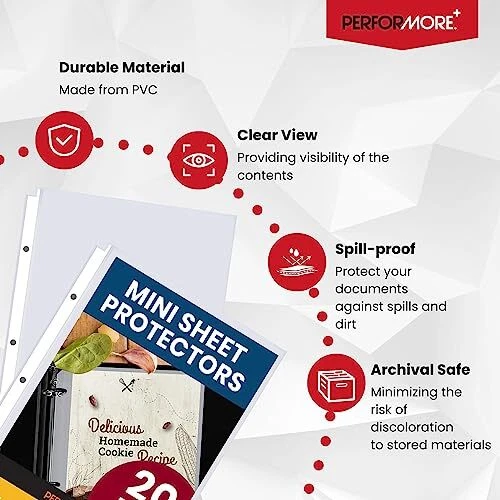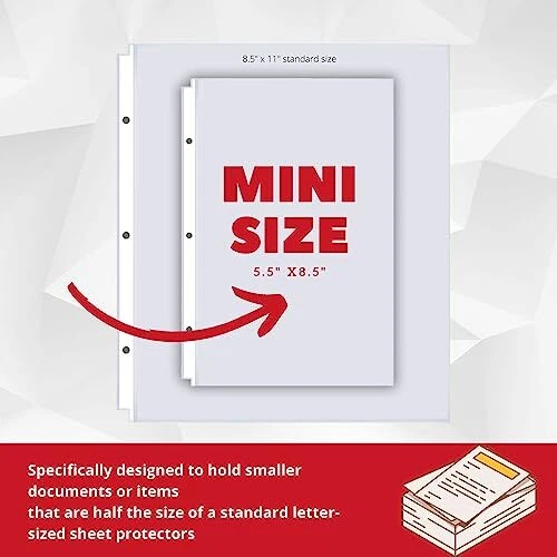 DURABLE CLEAR MINI SHEET PROTECTORS Small documents need protection too, and these sheet protectors are up to the challenge! Keep important records, documents, keepsakes, and safer from dirt and oils with protecting sheet covers. These Heavyweight Clear Mini Sheet Protectors offer maximum durability plus outstanding performance in preserving and protecting high-use presentation materials, letters, and reports. When paired with a mini 3-ring binder, our plastic sleeves are perfect for storing special items you frequently refer to as well as those you want to protect for years to come. The 5 Main Benefits of Heavyweight Clear Mini Sheet Protectors: ✔ PROTECTION Heavyweight thickness polypropylene sheet protectors provide optimum performance, designed durable for frequent daily use at home, school, or office. ✔ EASY TO USE No sheet punching necessary. Three holes in top-loading 5.5 x 8.5 inch sheet protectors keep your papers safe in the most mini binder or folder. ✔ POLISHED CLEAR VISIBILITY Each sheet protectors offers a sharp, transparent finish and perfect for showcasing your materials and makes presentations appear bold and bright. ✔ GREAT DESIGN Used across the globe to protect valuable works of art on paper because it is PVC free, acid-free, and archival sheet protectors which is made with non-stick material and produces “no copy transfer.” ✔ AFFORDABLE We’ve designed our archival-safe pack of 200 heavyweight clear plastic mini binder inserts in an affordable bulk sheet protector pack that will perfectly fit a number of important collectibles. 100% SATISFACTION GUARANTEE Buy with confidence! We stand by our products and offer a 30-day money-back/replacement guarantee! PROTECTION - Durable polypropylene sheet protectors provide optimum performance, designed durable for frequent daily use at home, school, or office. EASY TO USE - No sheet punching necessary. Three holes in top loading 5.5 x 8.5 inch sheet protectors keep your papers safe in the most mini binder or folder. POLISHED CLEAR VISIBILITY – Each sheet protectors offers a sharp, transparent finish and perfect for showcasing your materials and makes presentations appear bold and bright. GREAT DESIGN - Used across the globe to protect valuable works of art on paper because it is PVC free, acid free, and archival sheet protectors which is made with non-stick material and produces “no copy transfer.” AFFORDABLE– We’ve designed our archival-safe pack of 200 heavyweight clear plastic mini binder inserts in an affordable bulk sheet protector pack that will perfectly fit a number of important collectibles.