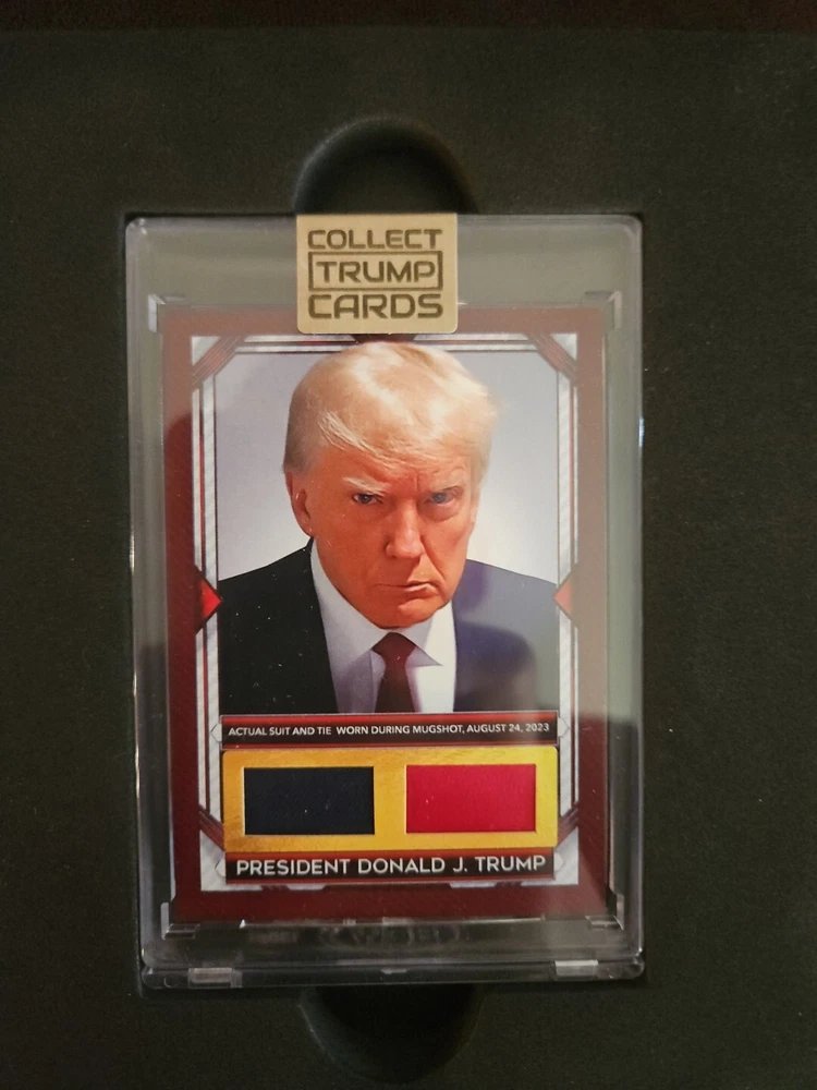 This is an official Collect Trump Cards physical card featuring a piece of Donald Trump's mugshot suit and tie. The card is made of high-quality card stock and has a standard size. It is an original non-sport trading card manufactured in the United States by Collect Trump Cards in 2024. The card is part of the Politics franchise and has the card number 109/200. It is a great addition to any collection of collectibles or non-sport trading cards. The card features Donald Trump, a famous political figure, and is in excellent shape.