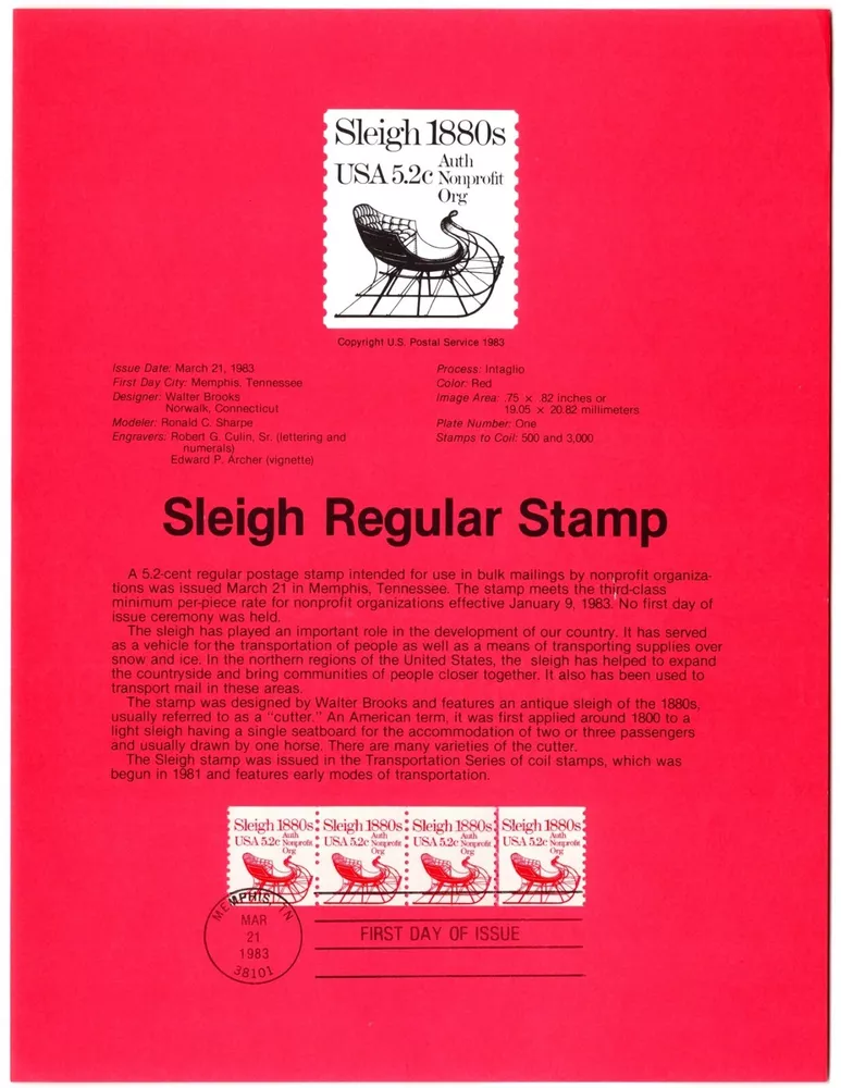 Official First Day Souvenir Page FDC Sleigh Coil Plate # Line Strip PNC 1983-07