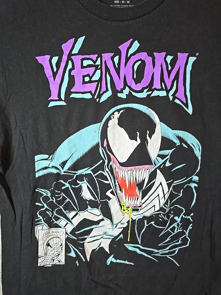This Official Marvel Men's Venom Antihero T-shirt in black is a must-have for any fan of the iconic character. Made in size medium, it features a striking graphic of the anti-hero on the front, showcasing his menacing appearance. The shirt is made from high-quality materials, ensuring that it is both comfortable and durable. Perfect for casual wear or for dressing up, this T-shirt is ideal for any occasion. The black color adds a touch of sophistication to the shirt, while the Venom character design makes it a unique and eye-catching addition to any wardrobe. Don't miss out on the chance to own this must-have T-shirt today!