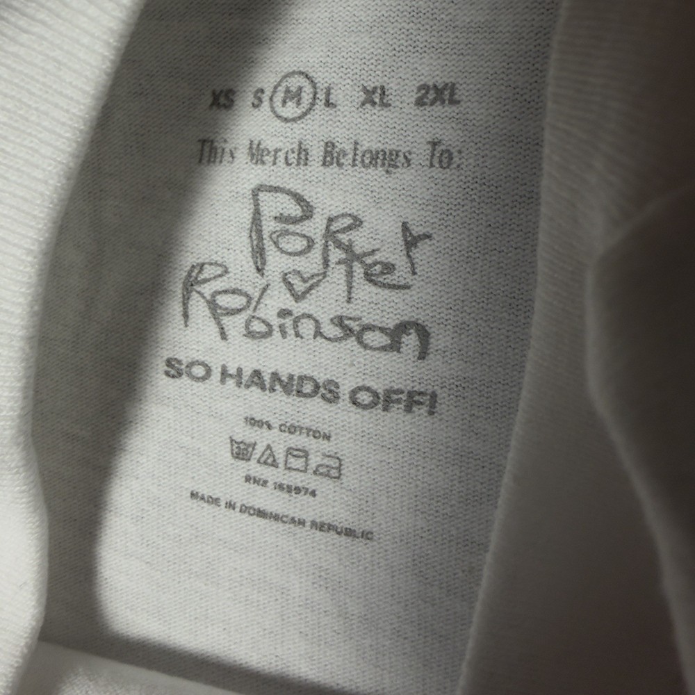 Official Porter Robinson T-Shirt in size medium, featuring a graphic print design and a round neckline. Made of cotton, this white short sleeve shirt is machine washable and suitable for regular fit. Perfect gift for any fan!