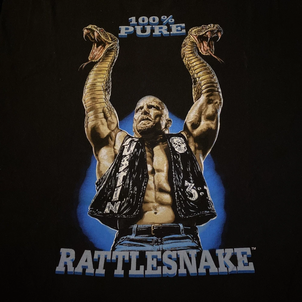 Official WWE Stone Cold Rattlesnake Expect No Mercy Shirt Size 5XL Black. Good condition. Awesome graphic. Some underarm discoloration marks from deodorant but not noticeable while wearing. Some fading on shirt. Graphic is in great condition.