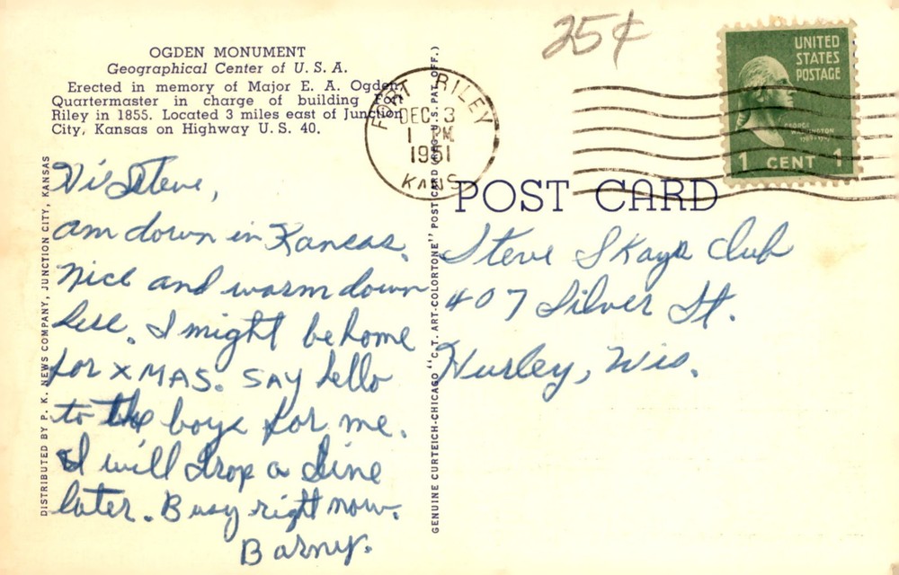 The Ogden Monument, at the Geographical Center of the U.S.A., commemorates Major E. A. Ogden, the Quartermaster who oversaw its construction in 1855 near Junction City, Kansas.
