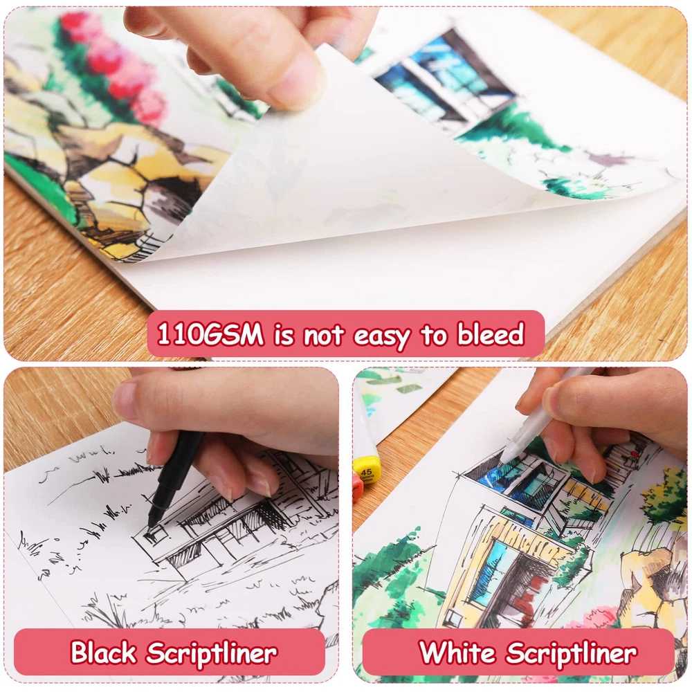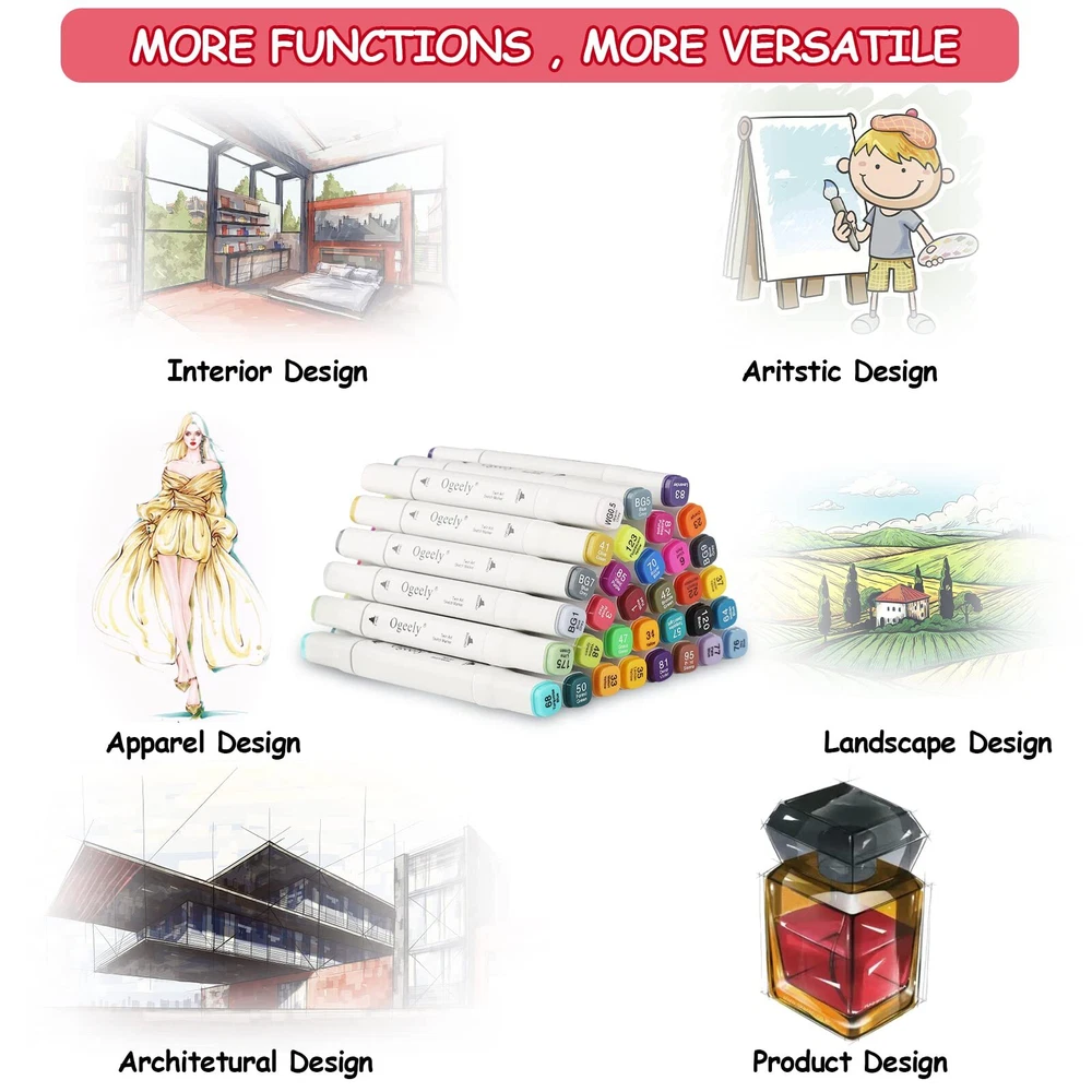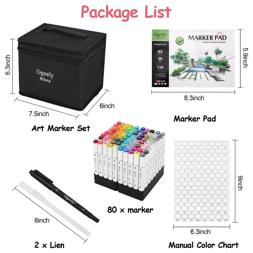 As an innovative office supply company, Ogeely is committed to providing you with the tools necessary to support your creating and art career. WHY CHOOSE Ogeely 80 COLOR ALCOHOL PERMENANT MARKER SET? √ Versatile Fine & Chisel Twin Tips The fine tip is of ideal size if you want to add finer details to your drawing while the chisel tip works great for quickly filling in large areas as it covers larger area. √ Seamless Color Blending Smudging or uneven coloring are not an option. Professional-grade permanent marker ink enables beginners to achieve excellent coloring effects, even with just a few strokes of the marker tip. √ Durable Alcohol-Based Ink If you're looking for an alcohol-based ink that'll dry quickly so you can layer colors and blend them seamlessly, this is it. √ 80 Vibrant Colors To color with this set is a joy, as each of the 80 vibrant hues is a sight to behold. A sturdy carrying case is included. Adults and children alike will appreciate this gift package, which includes an assortment of coloring books and pencils. √ Safe for Kids & Professional for Adults Ogeely markers are safe and non-toxic for youngsters to use in school and are produced with professional-quality materials to meet illustration-grade specifications. √ Bonus Marker Pad and Dual-Tip Liner To avoid ink bleeding through the drawing paper sheets (which all alcohol-based markers do), we included a 5.8” x 8.3” professional marker pad in the package. A bonus black liner is here to make drawing fine lines an ease. WHAT YOU GET 80 x Twin-Tip Alcohol Markers 1 x Black Dual-Tip Liner 1 x White Liner 1 x Organizer Case 1 x 5.8” x 8.3” Professional Marker Pad 1 x Color Chart Manual MARKERS WITH CHISEL TIP & FINE TIP--Ogeely coloring markers set includes both chisel and fine tips, which can help you achieve a variety of creative possibilities. When need to cover a large area quickly, make thick lines or coloring, drawing etc. then use the chisel tip. When need to write, highlight, or do calligraphy then use the fine tip. It's better not to leave the tip on paper for a long time to avoid ink bleeding. 82 BRIGHT COLORS--The 82 vibrant coloring markers contain with a black outliner and a white outliner. We use high quality materials to make these markers, which allows the color to stay bright on paper. The Ogeely drawing markers are non-toxic as well as acid-free and with waterproof ability, which can be used on a lot of different surfaces. Comes with a black liner with dual-tip, this can help you make fine liner easily. PORTABLE TO CARRY--The coloring markers are designed with color coded caps, this design helps you easily find the colors you need. You will also receive a coloring pen organizer made of premium oxford fabric material. Robust zipper makes this organizer durable and sturdy, which can storage markers and show the coded caps for you to find the suitable marker, helps make painting easier and funnier also makes this designer marker kit a great choice for traveling. PROFESSIONAL MARKER PAD--All the coloring markers will bleed through paper, to provide a happy drawing for you, we've included a 5.8" x 8.3" professional marker pad to fix this small problem. Allowing you to blend, mix and layer as much as you want in order to create your desired style without smudging back and next other sheets. You can use this marker pad for other drawing media. EASY COLOR BLENDING & LAYERING INK--Ogeely dual-tip artist markers are designed to make it easy to merge and layer to avoid streaks and also to speed up drying process. Layering one color on another kind of color, you are able to create various of color combinations. Your satisfaction is our priority, when you meet any problems during painting with this colorful marker set, just feel free to contact us, we are always here ready to help you.