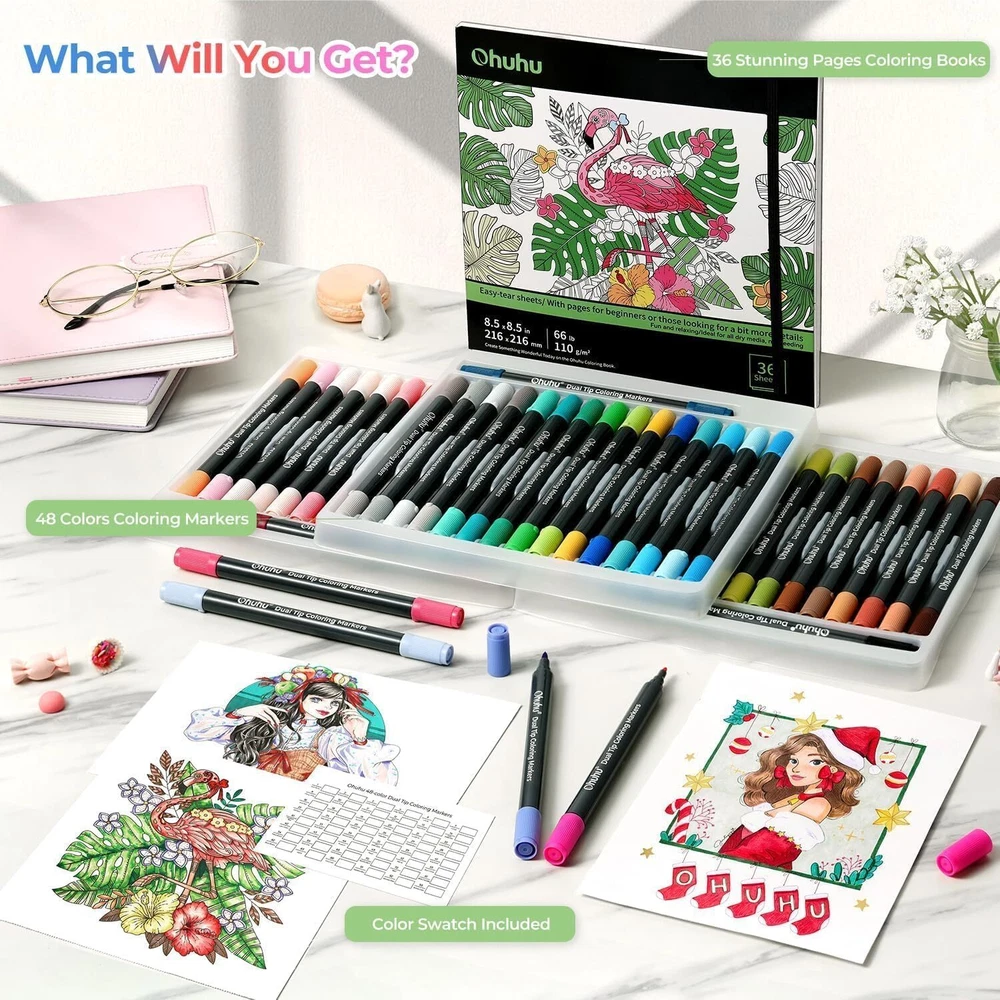 DELUXE COLORING BOOK: Make your artwork come to life! Ohuhu coloring book comes with 36 pieces of 110 gsm bleed-proof heavyweight paper that prevent smudging, bleeding, and feathering for clean artwork. Measuring 8.5 by 8.5 inches, the book provides ample space for your imagination to run wild. Plus, to find out the best color combo, you can try on the corresponding scale-down templates first! DUAL TIPS, DUAL POSSIBILITIES: We know your creativity is limitless, and Ohuhu drawing pens are here to help you unleash it with double wear-resistant tips—brush and fine! The 1mm fine tip can glide through the details for intricate coloring, writing, and doodling, while the 1-3mm flexible brush tip flows through the large area art projects for shading, coloring, blending, and more. 48 HIGHLY PIGMENTED COLORS: There are more one-of-a-kind artworks than ever thanks to the 48 vibrant color choices! The basic colors and skin tone colors go hand in hand to work out the best color scheme for your drawing, coloring, sketching, doodling, etc. Better yet, the color-coded and printed color number allows you to spot your desired color in a breeze. WATER-BASED INK, QUICK-DRY AND NON-BLEEDING: Ohuhu water-based ink covers all the features that a decent ink needs: sustainable, non-toxic, safe,quick-dry, non-bleeding and conforms with ASTM D-4236. Ohuhu marker pens are safe for your paper sheet and yourself. In addition, 2.2g large capacity of the ink and smooth ink flow ensure your imagination never misses a beat! ALMIGHTY GIFT: Ohuhu coloring book & art pens is your passport to an artistic wonderland that knows no bounds! Ohuhu marker set is perfect for calligraphy, planners, scrapbooks, posters, artist decoration and more. For effortless organizing and storage, we’ve adopted sustainable paper package and included recyclable marker tray--- no more marker clutter!
