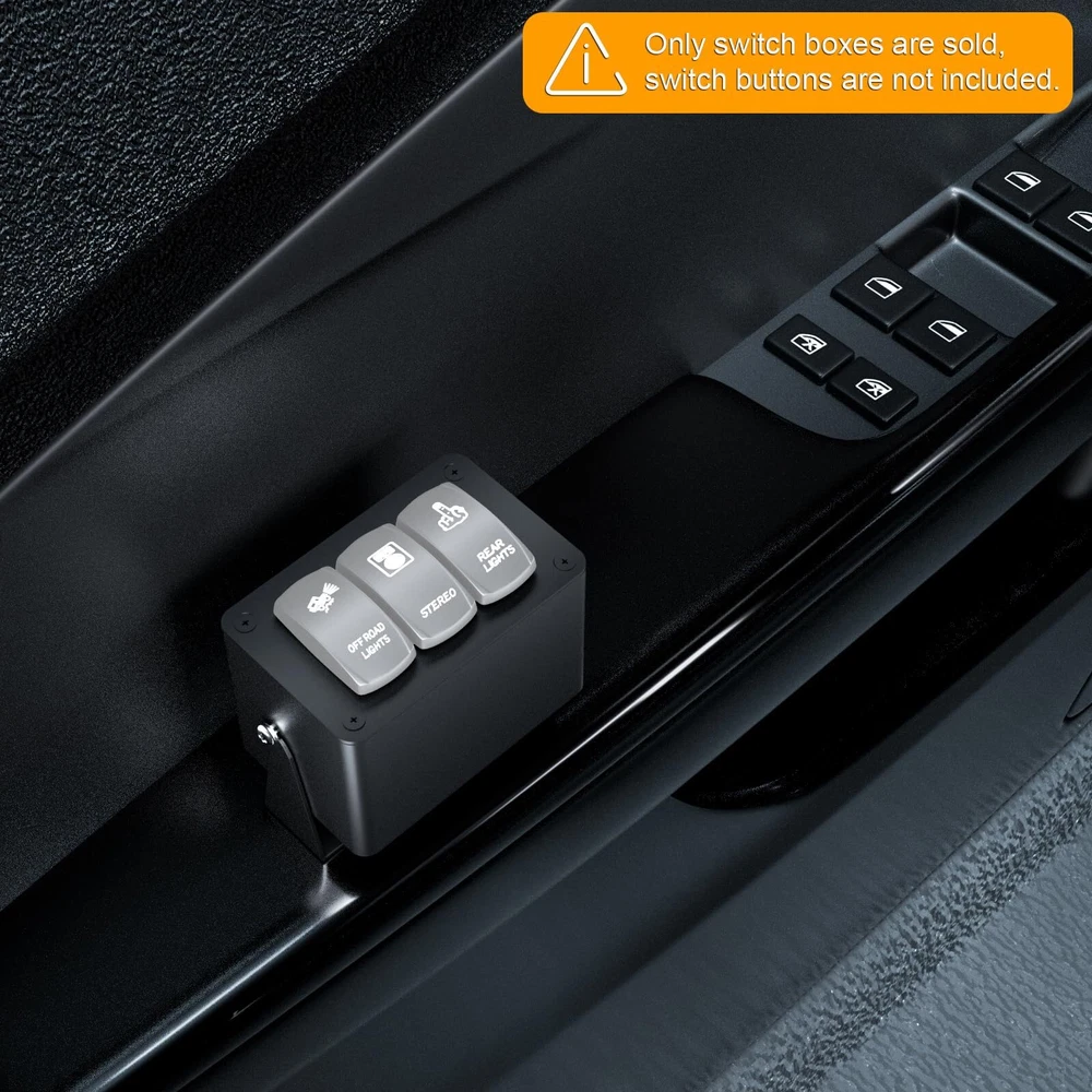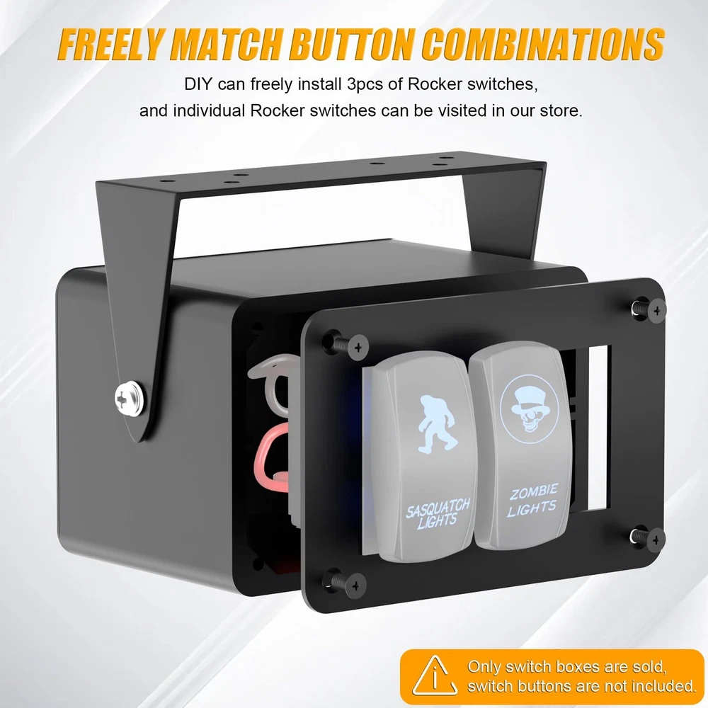Applicable: This switch box for 3 Gang Switch Installation for UTVs/ATVs, trucks, trailers, RVs, caravans, buses, marine boats, yachts etc. Size: 4''x2.7''x2.8''.Cutout dimensions 3.9''x2.6''x2.6''. Sturdy Box: The switch box is designed to be waterproof,weatherproof and splash proof. The box is made of quality aluminum and protects the switches against short circuit and damage. Surface Mount: With surface mount enclosure. The box can be mounted either on the dash board, under dashboard, middle console or anywhere on the car. The bracket can be adjusted 360 degrees.This gives you more mounting options. DIY Switch Assembly: We come with a 3-hole Panel (excluding switches). You can purchase the Rocker Switch separately and freely combine it according to your own needs.