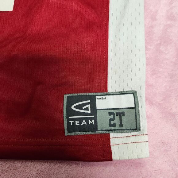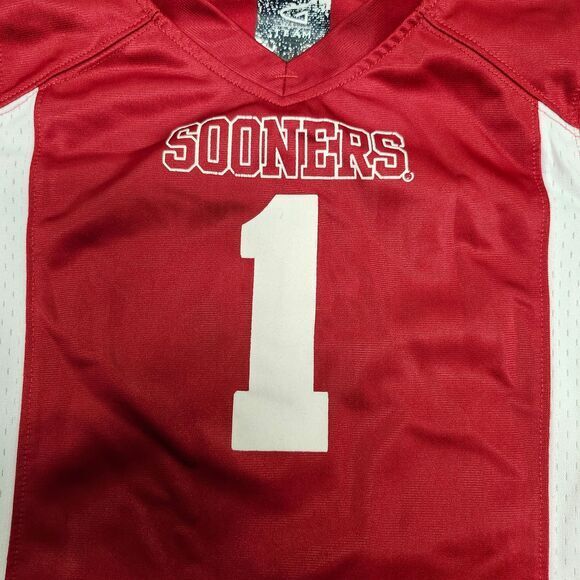 Show your little one's Sooner spirit with this authentic Oklahoma football jersey! Perfect for game days, tailgating, or everyday wear. The vibrant red and white design features the iconic 'Sooners' text and #1, making your child feel like part of the team. Comfortable and durable, it's ideal for active kids who love to cheer on their favorite college squad. Sport: Football Keywords: Oklahoma Sooners, football jersey, youth sports, college apparel, team spirit, athletic wear, toddler size, game day outfit, fan gear, NCAA