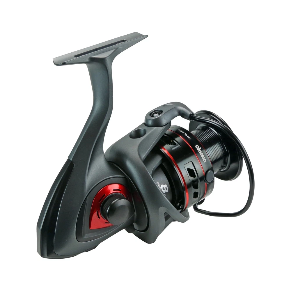 Ceymar A spinning reels offer superior performance, with a multi-disc, oiled felt drag system, Okuma's Flite shaft system for smoother casts, and a 7BB+1RB bearing system with precision machine cut brass pinion gear. I-shaped and T-shaped TPE handle knobs provide comfort and a secure grip, while the Quick-Set anti-reverse roller bearing ensures reliable hooksets. The Precision Elliptical Gearing system ensures optimal gear meshing for maximum efficiency. The 500, 2000, 2500, 3000 and 4000 sizes will be offered in a 5.0:1 gear ratio, 6000 size in a 4.5:1 gear ratio and the 8000 in a 4.8:1 gear ratio. Flite shaft system for increased smoothness 7BB+1RB for ultimate smoothness Quick-Set anti-reverse roller bearing Corrosion resistant frame, sideplate and rotor Ergo grip handle knobs