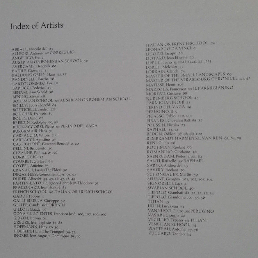 Offered for your consideration is this very unique and truly special 304 page book created for the Royal Academy of Arts depicting the Woodner Family Collection of “Old Master Drawings”. This catalog of art is for the Art Lover and Art Student alike. The color plates in this book are truly breath taking and each work of art is accompanied by a short explanation of the art and the artist. The catalog is divided into schools for each of the artists; Italian School, German and Swiss School, Dutch, Flemish, French and finally Spanish. The artist too numerous to name all here (see photo of Index) include Botticelli, Degas, Da Vinci, Matisse, Picasso, Signorelli and Vannucci to name a few. The Woodner collection traveled the world in the 80’s and the collection is now housed in the National Gallery in Washington DC. Mr. Woodner was truly unique individual with a great love for art and an accomplished artist himself. The book contains over 100 photos of “Old Master Drawings” and paintings. The catalog is in very good condition and will be shipped via “Media Mail” unless otherwise specified. If there are any specific artists work of art you want to determine is in the catalog, or if you have any questions, feel free to email me. Thank you for your consideration of this item.