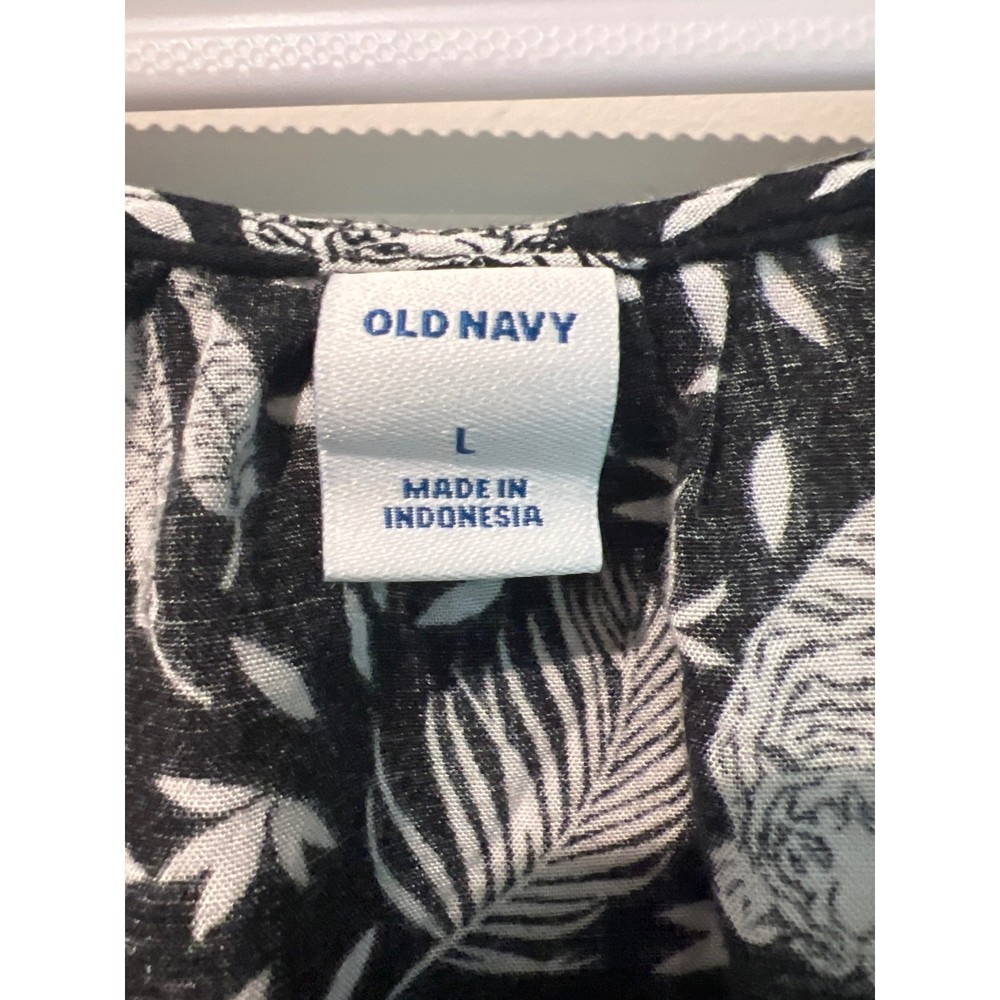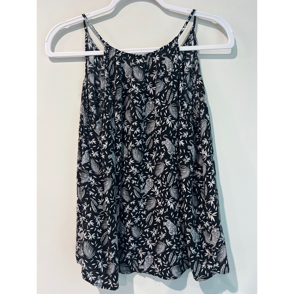 Lightweight rayon camisole features a unique black and white tropical print with detailed tiger and palm leaf motifs. Designed with a flattering V-neckline and adjustable spaghetti straps, this breezy top offers a relaxed fit perfect for warm-weather layering or standalone wear. The soft, woven fabric ensures a comfortable drape for casual outings. Brand: Old Navy Material: 100% Rayon Pattern: Tiger, Palm, Tropical Color: Black, White Neckline: V-Neck Sleeve Type: Sleeveless Straps: Adjustable Spaghetti Straps Fit: Relaxed Style: Camisole, Tank Top Season: Summer, Spring Care: Machine Wash Cold Keywords: Jungle, Safari, Animal Print, Boho, Festival, Minimalist, Monochrome, Coastal, Vacation, Exotic, Graphic Tee alternative, Lightweight, Breathable
