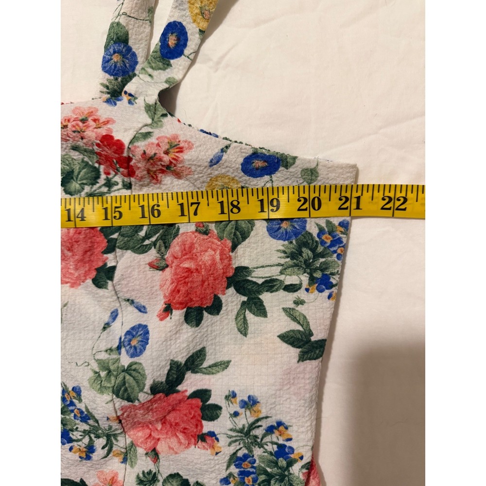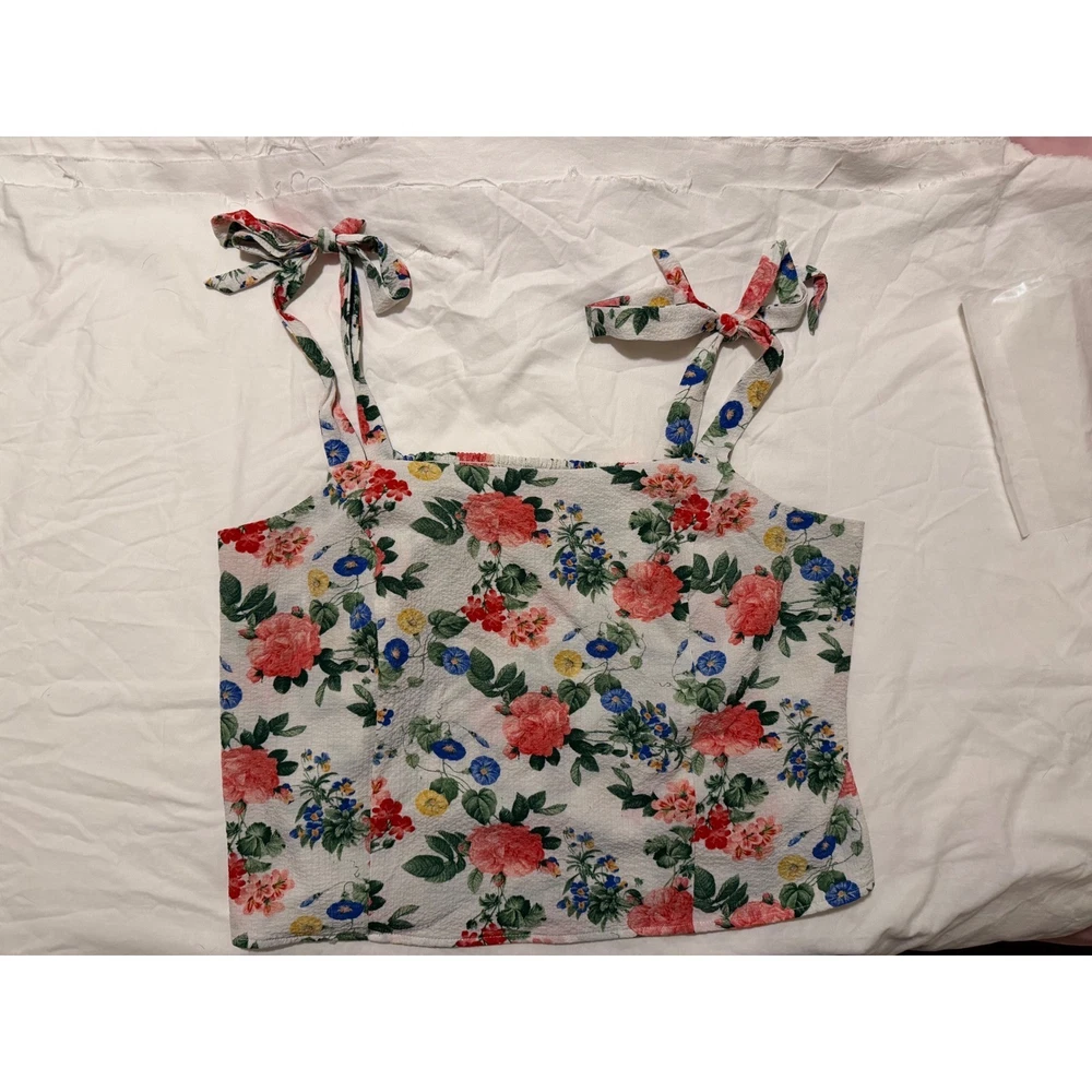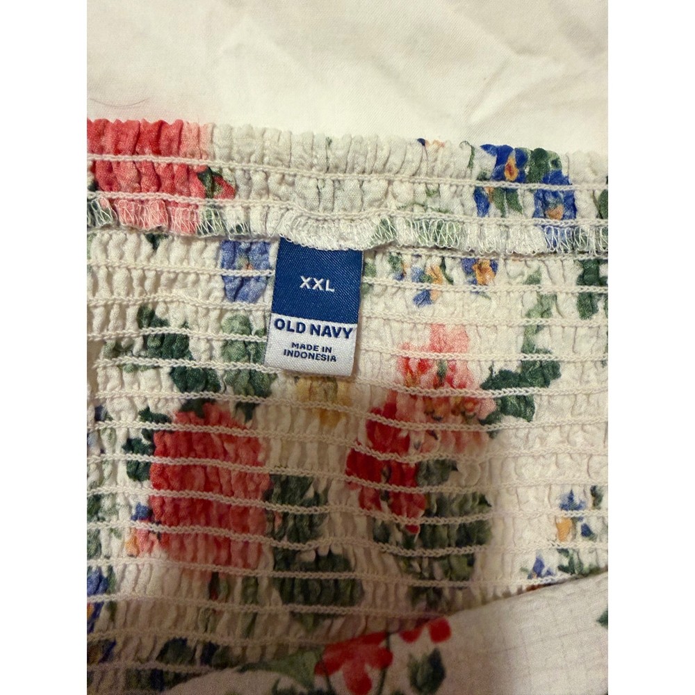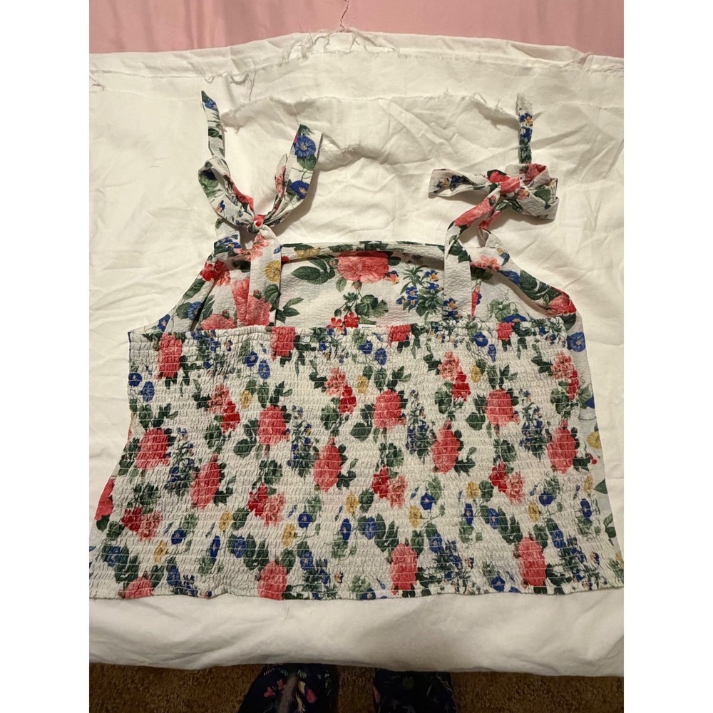 A charming white floral smocked cami tank top. This piece features adjustable tie shoulder straps and a comfortable smocked bodice for a flattering fit. Perfect for a sunny day out or a casual vacation. Measurements: • Chest: 21 in • Length: 12in straps are adjustable Type: Tank Department: Women Style: Cropped Material: Polyester, Spandex Neckline: Square Neck Sleeve Length: Sleeveless Sleeve Type: Strappy Sleeve Pattern: Floral Accents: Bow, Strap Features: Adjustable Strap Fit: Regular Fabric Type: Woven Occasion: Casual Closure: Tie Season: Summer, Spring Strap Type: Spaghetti Keywords: Old Navy, cami, tank top, floral print, smocked, tie straps, summer, casual, vacation, boho, feminine, lightweight, plus size