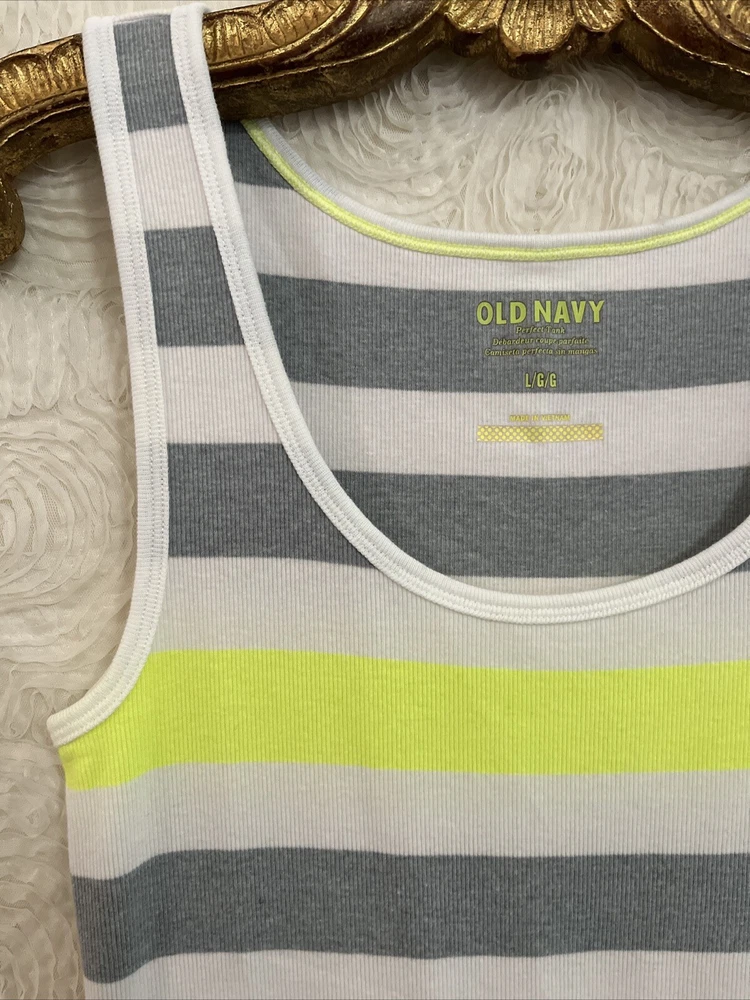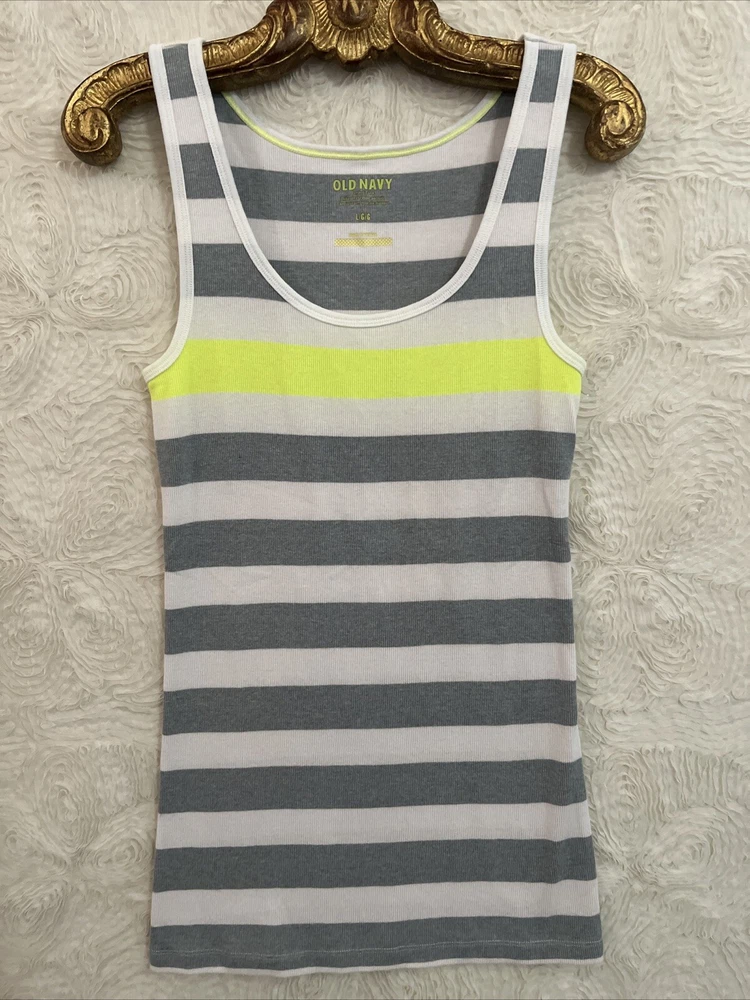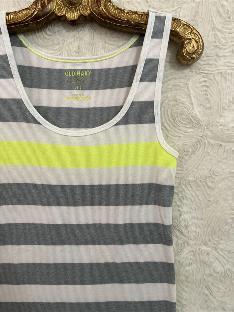 Item Details: Old Navy Tank Top Cotton Blend Stretchy/Contoured Fit Color: White, Gray, Neon Green Size: Large (to ensure fit, please refer to measurements) Shoulder: Chest: Stretches Sleeve/shoulder seam to sleeve edge: Waist: Stretches Hip: Shoulder to Hem: 28.5" Condition: Excellent Condition; No Flaws to Note Condition Rating: 2 Condition Rankings: NWT = Brand New, tags still attached, never used. Mint Condition = Item may have been used, but shows no signs of wear. Excellent Condition: Used, but with minimal signs of wear. Very Good Condition: Used and shows moderate signs of wear, may need repairs, and is sold As Is. Fair Condition: Item is showing significant signs of wear, may need repairs, and is sold As Is. PLEASE NOTE: Most of our items are Pre-Owned or Vintage. Unless otherwise noted, items will not be in new condition. Prior to listing, we carefully inspect each item for flaws, as needed, we will note flaws and include a photo of of flaws. Unless otherwise noted, grossly misrepresented, or incorrect item is sent, buyers agree to buy items AS IS. We do not accept returns. Condition Ratings: 1 = New/Unused Condition; 2 = Pre-Loved/No Flaws to Note; 3 = Pre-Loved/Mild Signs of Wear; 4 = Pre-Loved/Needs Repairs or Shows Significant Wear/Flaws *Measurements are in Inches