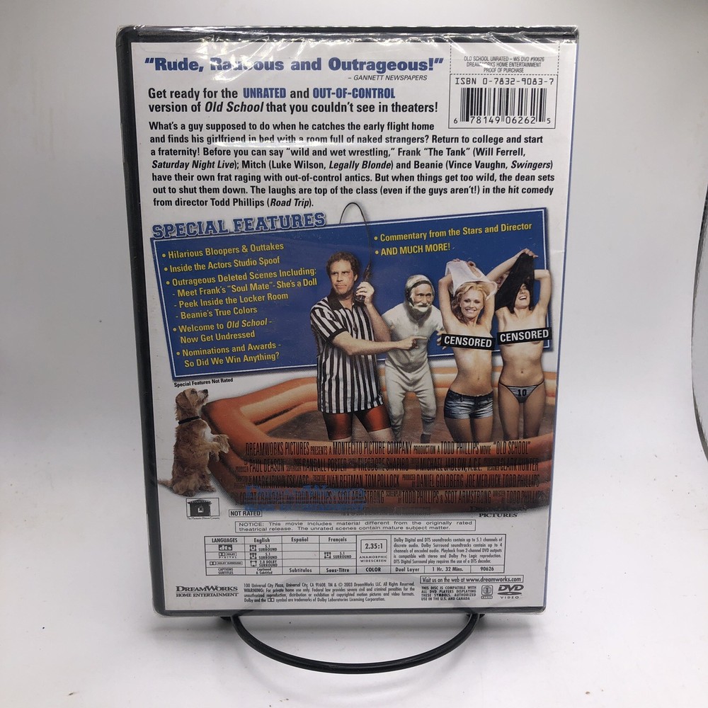 Director: Todd Phillips Features: Widescreen Movie/TV Title: Old School Language: English Actor: Vince Vaughn, Luke Wilson, Will Ferrell Type: Movie Case Type: Tall/DVD Case Genre: Comedy Release Year: 2003 Format: DVD Seller Notes: “Please see photos. All USED Movies will have some minor scratches and blemishes on cases.” Region Code: DVD: 1 (US, Canada...) gtin13: 0678149062625 Country/Region of Manufacture: United States Edition: Widescreen; Unrated Version UPC: 0678149062625