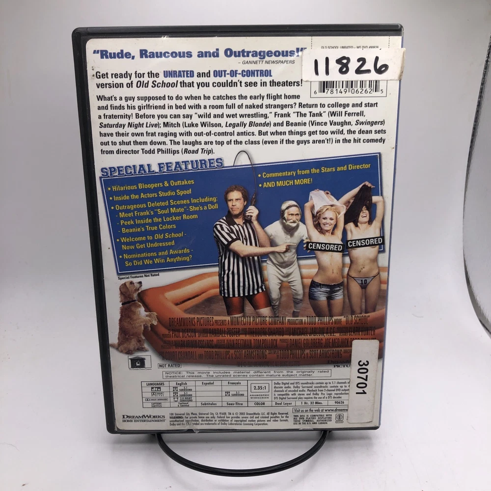 Actor: Vince Vaughn, Luke Wilson, Will Ferrell Type: Movie gtin13: 0678149062625 Country/Region of Manufacture: United States Genre: Comedy Language: English UPC: 0678149062625 Edition: Widescreen; Unrated Version Features: Widescreen Case Type: Tall/DVD Case Director: Todd Phillips Movie/TV Title: Old School Release Year: 2003 Seller Notes: “Please see photos. All USED Movies will have some minor scratches and blemishes on cases.” Region Code: DVD: 1 (US, Canada...) Format: DVD