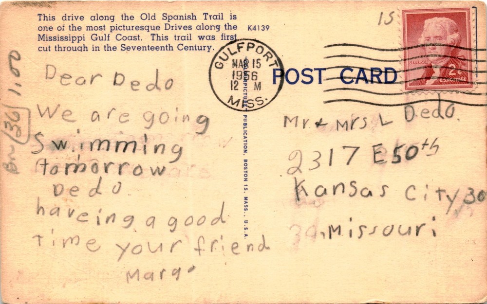 MAKE AN OFFER. THE MORE YOU BUY THE BETTER DEAL I WILL ACCEPT The postcard features a picturesque view of moss-draped live oaks along the Old Spanish Trail on the Mississippi Gulf Coast. The Old Spanish Trail is a historic route that was first cut through in the Seventeenth Century. The sender mentions going swimming the next day in Gulfport, Mississippi, in 1956. The postcard is addressed to Mr. & Mrs.