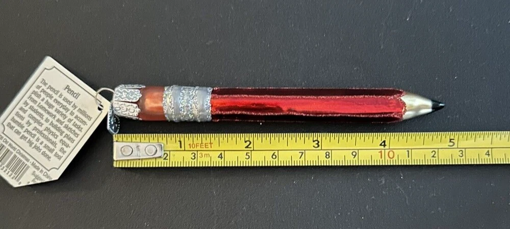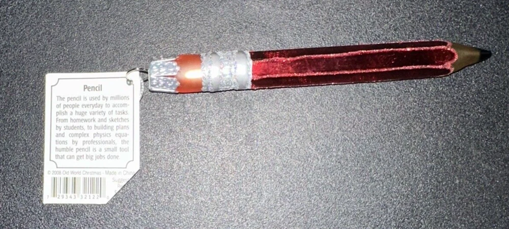 Add a touch of whimsy to your festive decor with the Old World Christmas Pencil Red Ornament. This charming glass piece, reminiscent of a classic pencil, is a delightful addition to any Christmas collection. Its vibrant red hue and unique shape make it an eye-catching decoration that is sure to spark conversation. Crafted in 2008, this ornament lacks the nostalgic appeal of vintage items but still brings a cheerful ambiance to your holiday setup. At 4 3/4 inches long, it's perfectly sized to dangle from your tree or to rest on a mantel or shelf, bringing the spirit of Christmas into your home.