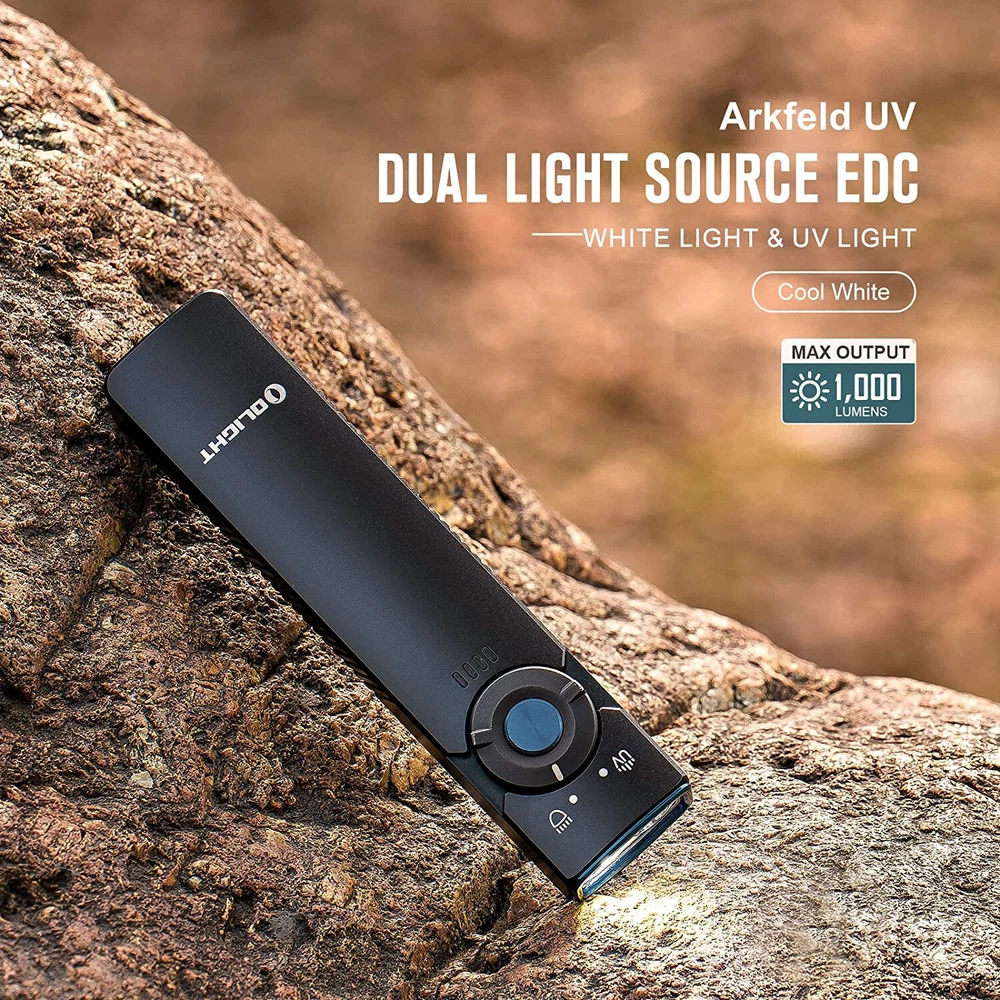 Brand New, Olight Arkfeld UV and White 1000 Lm LED Flashlight for AC Leak, Pet Urine Detection (Cool White LED, Black) ● Olight’s First White LED & UV Light: A traditional White LED with 5 brightness levels and a max output of 1,000 lumens combined with a UV light. ● Versatile UV Light: The UV light emits a powerful 580mW (365nm wavelength)light to help you see things otherwise invisible to the naked eye. From checking counterfeit money, identifying for fluorescent minerals or insects to making sure your hotel room is clean. ● Two Color Temperatures Available: Cool White Light can give people a bright and sober feeling and enables greater concentration while Neutral White Light gives people a comfortable, pleasant, and peaceful feeling, depending on your personal preference. ● Ultra-thin & Anti-slip Flat Body: A unique flat shape design with anti-slip grip milling makes it extremely comfortable to hold in your hand or carry in a pocket. (Only 3.07oz in weight and 0.59 inches in thickness) ● Deep Carry Two-way Pocket Clip with a Lanyard Hole & Magnetic Base: The two-way clip clamps tightly onto a shirt, pocket or hat for easy carrying. The clip also includes an integrated lanyard hole. The Arkfeld UV also features a magnetic base allowing you to easily attach it to a metal surface. Arkfeld UV provides white light + UV dual light sources in a slim rectangular EDC flashlight. It uses a high-performance LED with a maximum brightness of 1,000 Lumens. With the new UV LED, it greatly expands the possible applications of this model. The selector allows users to quickly switch between the two lighting modes, simple and convenient. MAX OUTPUT: 1,000 lumens Battery: Built-in 1050mAh Lithium Polymer Battery MAX RUNTIME: 8 days MAX THROW: 85 meters MAX LIGHT INTENSITY: 1,808cd LIGHT FORM: High-Performance Cool White LED (5700K~6700K) UV Light Power: 580mW Wavelength: 365nm TECHNICAL CHARACTERISTICS DIMENSIONS: Length: 4.33in/110mm; Width: 0.98in/25mm; Height: 0.59in/15mm LIGHT SOURCE: LED WEIGHT: 3.07oz/87g ( Battery Included) WATERPROOF: IPX7 BODY MATERIAL: Aluminum Alloy DROP TEST: 1m USE: Daily Lighting; Fluorescent Agent Detection; Stain Detection; Hotel Cleanliness Checking; Ringworm Detection WARRANTY: Olight's 2 Years Warranty IN THE BOX Arkfeld UV (Battery Included) x 1 MCC 1A Magnetic USB Charging Cable x 1 User Manual x 1