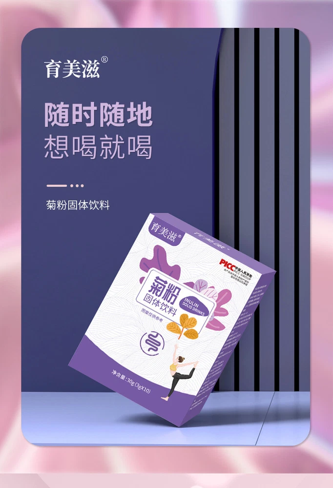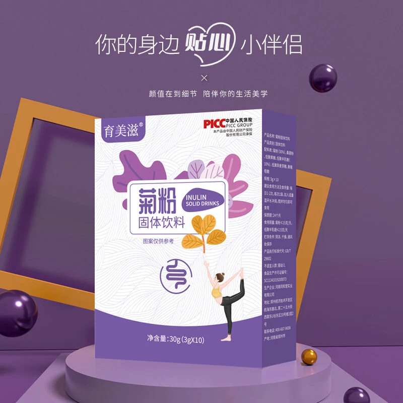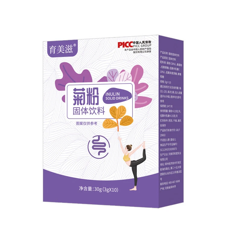 Note: This product can not replace the drug Product Category: solid beverage Product Certification: No Storage conditions: room temperature Shelf life: 24 months Use Category:Probiotics Storage Method:Sealed, in a cool and dry place Product Name:Inulin Solid Drink Production Licence Number:SC11341019200073 Packing specification:30g/box Net Content:30g Type:Dietary Fibre/Fruit and Vegetable Fibre