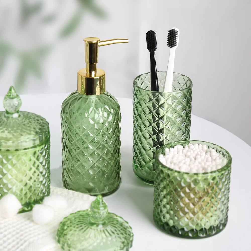 RYTOXILO Green Bathroom Accessories Set, 4 Pack Olive Green Bathroom Decor Accessory Sets Complete, Diamond Glass Soap Dispenser and Toothbrush Holder Set for Bath Counter Organizer Essentials 【ATTRACTIVE 4 PACK GREEN BATHROOM ACCESSORIES】 Get these DIAMOND STYLE elegant additions to your bathroom right now! Let these green bathroom accessory set brighten your bathroom nicely! This green bathroom decor is perfect for every bathroom theme no matter boho, modern, farmhouse, vintage, and western, you name it! You would get a SOAP DISPENSER, a TOOTHBRUSH HOLDER, a QTIP HOLDER, and a COTTON BALL HOLDER in just ONE set! 【GORGEOUS DIAMOND PATTERN DESIGN】Diamond is a symbol of purity and magnificence. Such a diamond-style glass olive green bathroom accessories set could be easily suitable for your bathroom themes. Brighten up your bathroom space in a way that’s as unique as you are. Each green bathroom set accessories is handcrafted by experts, and each diamond pattern on it is equally sparkling, not only in your bathroom but also in the eyes of every guest who enjoys it. 【STURDY GREEN GLASS MATERIAL】All these green bathroom accessories sets complete are made of high-quality green glass. Elegant, sturdy, and heavy-weighted. Not easy to be broken or tip over. Let those plastic inferior bathroom accessories sets leave your bathroom, and let this green bathroom soap dispenser and toothbrush holder set complement your bathroom vanity decor. 【PRACTICAL FOR USE】If you are a person who loves enjoying life, you would find that the green bath accessories sets meet all your daily needs in your life. The 13oz Soap dispenser filled with hand soap/lotion/face wash could be used for a long time. The green bathroom organizer essentials could hold multiple toothbrushes, toothpaste, combs, and shavers at the same time. 2 jars could be used for qtips, cotton balls, cotton swabs, cotton pads, etc. Makes your bathroom look tidy and wonderful. 【WONDERFUL GIFT IDEA & SUPERIOR QUALITY SERVICE】This green bathroom accessories decor set is a great and unique gift for housewarming, wedding, birthday, Mother's Day, Thanksgiving Day for mom, sister, colleague, and friends. We provide 100% product quality guarantee, the fastest, and the best service to ensure your satisfaction. Please feel free to let us know if you have any questions. SHIPPING Domestic Buyers - We have confidence in our products, but if you are not fully satisfied please contact us within 30 days of purchase and you will get full refund. - We ship within 3 business days of payment, usually sooner - We offer FREE shipping on all orders! - We only ship to the lower 48 states, no APO/FPO addresses or PO Boxes allowed International buyers – please note: Import duties, taxes, and charges aren't included in the item price or postage cost. These charges are the buyer's responsibility. - Please check with your country's customs office to determine what these additional costs will be prior to bidding or buying. * Order Cancellation Policy ** You can return a product for up to 30 days from the date you purchased it. 1. The seller reserves the right to cancel the special case only due to eBay cancellation fee. 2. The decision of seller is the final. 3. The seller will respond to the cancellation request within 2 business days. Please wait for the result of cancellation. 4. In case the cancellation is not completed by some reasons, the buyer can follow the options below to get the refund. 4.1 The buyer can reject the item when it arrives. 4.2 The buyer can send the item back to the seller within 30 days If the buyer receives item (USA Shipment ONLY). The seller will provide the FREE return label to the buyer when the buyer opens " Return Item" case on eBay by using the reason as "Change my mind" ONLY. 5. When buyer has placed the order. The order will be processed and completed by automatic warehouse system within 5 minutes. In case that buyer sends the cancellation request after 5 minutes of placing the order, the request will be rejected. **Sending direct message to cancel the order is not allowed for every case.* Return Policy For the return case - If buyer would like to return the items for refund or replacement, please CONTACT SELLER to receive the free return label from seller. The refund or replacement will be processed with the tracking number of return label which is provided by seller only. The other ways of return which are not approved by seller will not be processed for the refund or replacement.